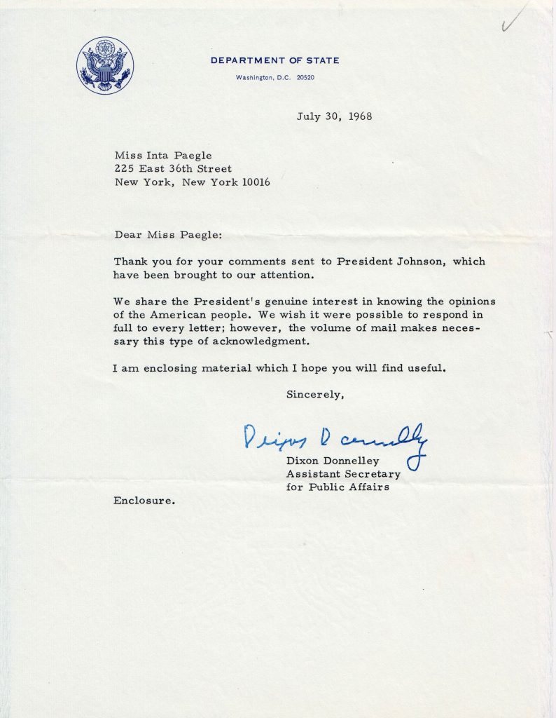 Response to Inta Paegle from Dixon Donnelly, Assistant Secretary for Public Affairs of United States, 1968. Source: LNA LVA F.2944.