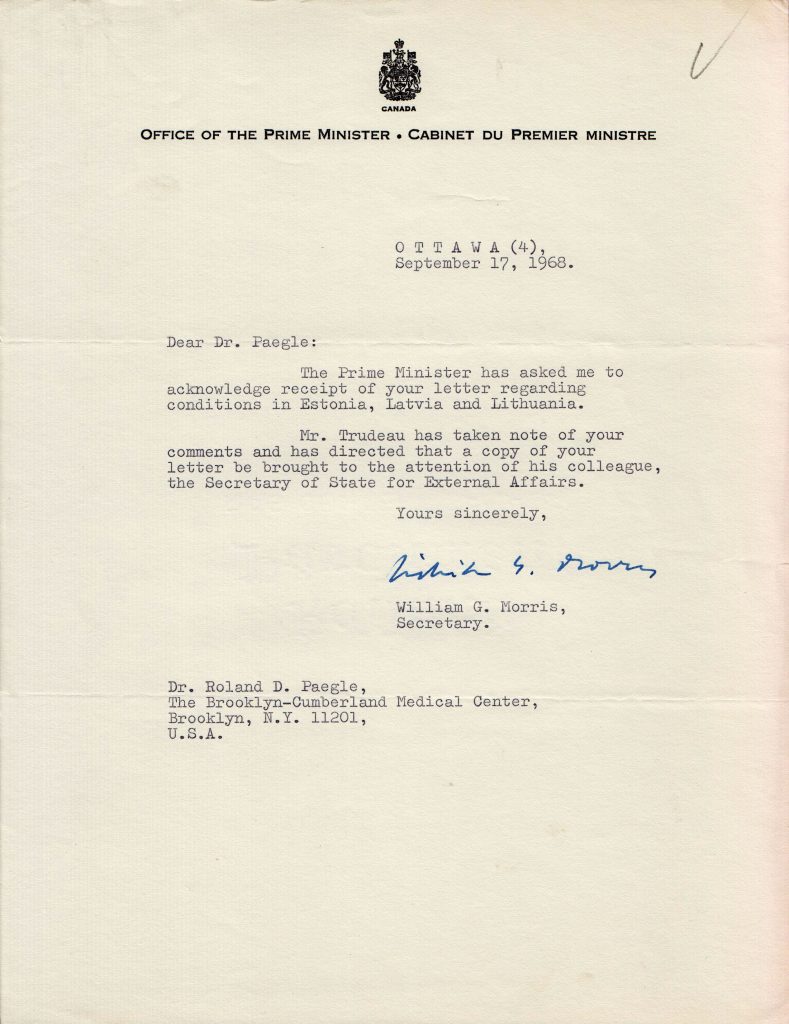 Response to Dr. Roland Paegle from William G.Morris, Secretary of Canada for External Affairs, 1968. Source: LNA LVA F.2944.