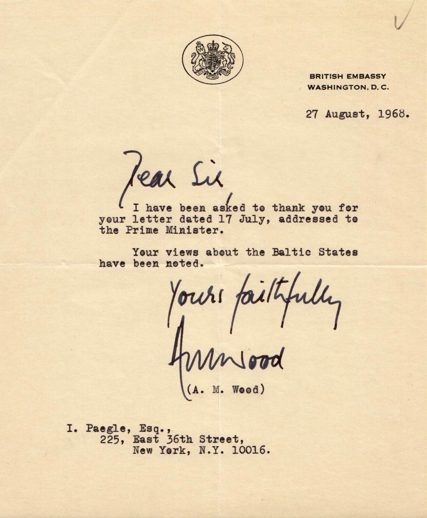 Response to Inta Paegle from A.M.Wood, a representative of the British Embassy in Washington, 1968. Source: LNA LVA F.2944.