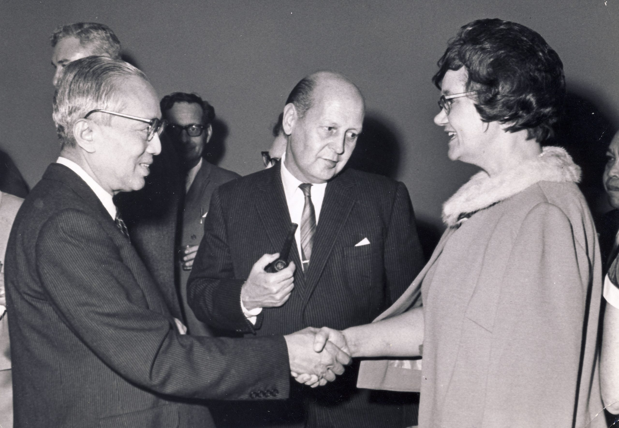 UN Secretary General U Thant speaking with Dagmara Vallens, a representative of BATUN, at the cocktail party he gave for the correspondents accredited to United Nations, at the end of 1960s. Source: Museum of the Occupation of Latvia.