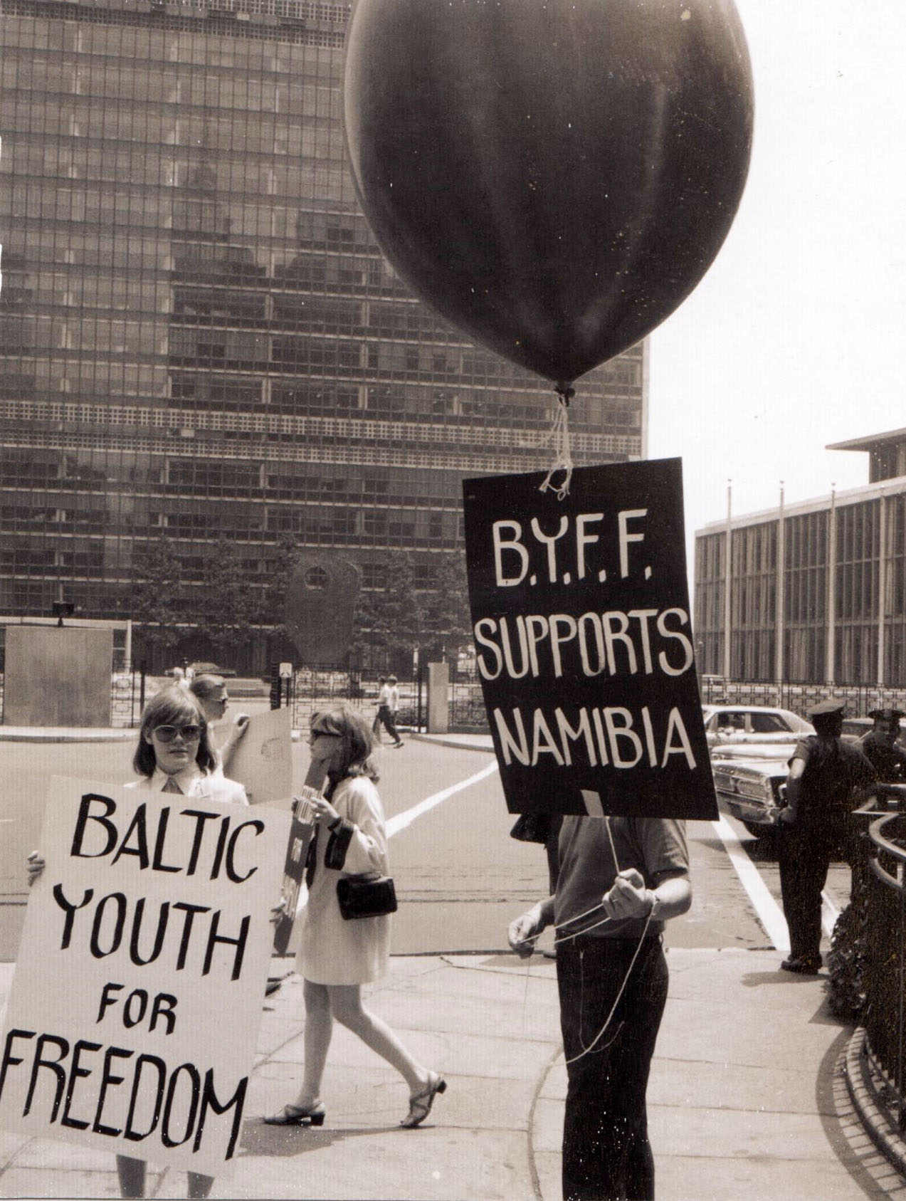 Baltic Youth for Freedom in front of the UN rallying for the freedom for Namibia, 1968. Juta Ristsoo is holding the sign “Baltic Youth For Freedom”. The balloons that appears in the photos were meteorological balloons and with slogans about Namibia after the rally were launched in the direction of the UN headquarters . Source: LNA LVA F.2944