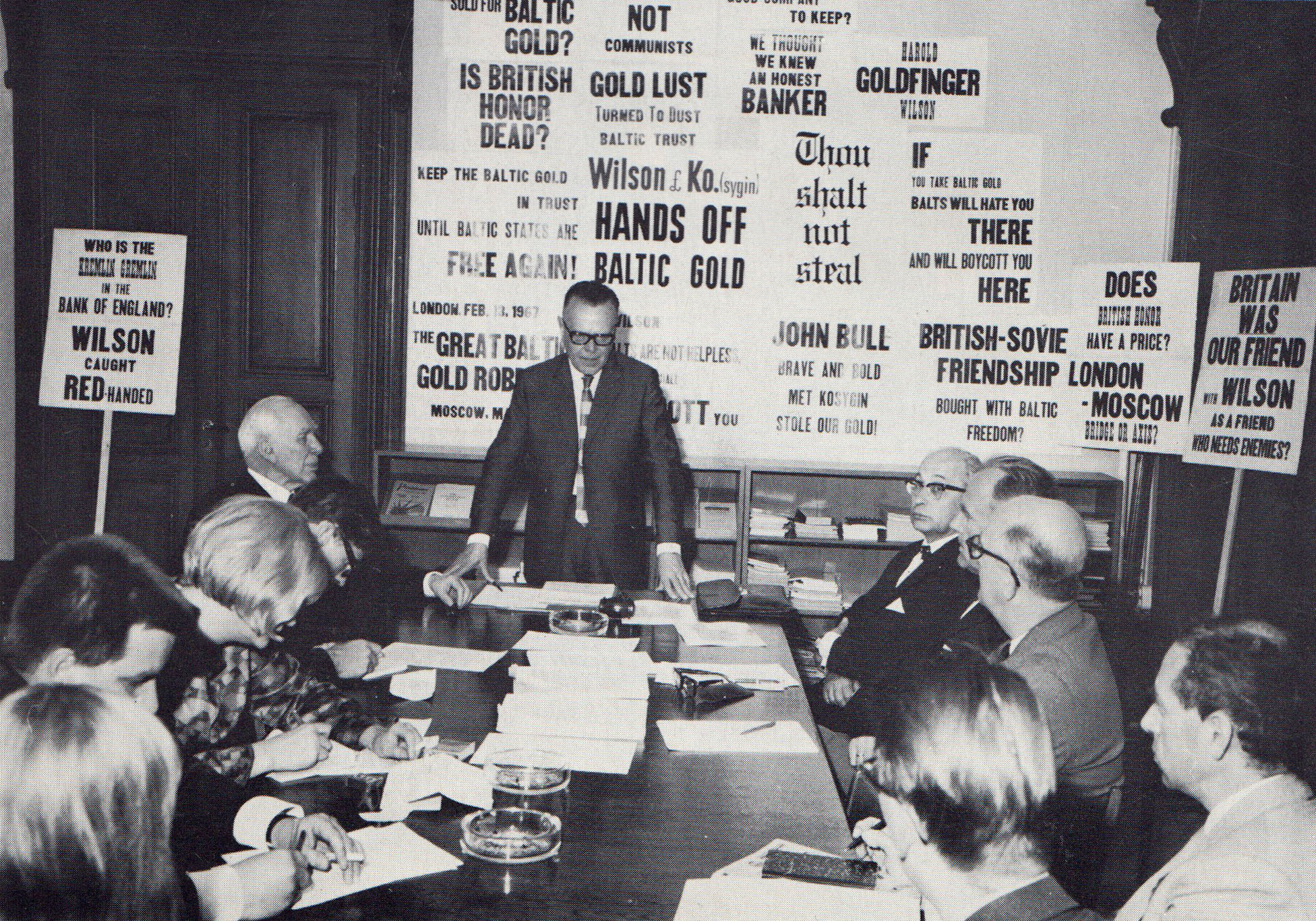 Operation Goldfinger (June 1967/68) was the first and probably the most intensively prepared for and successfully executed worldwide public protest in BATUN’s history. The Soviets claimed that the Baltic gold and ships that had been evacuated to the West were their property. For a long time, both sides had been making claims against the other for the restitution of property, like the Baltic gold, or investment losses caused by the other side. The UK Government, which continued to the de jure recognition of the Baltic States after World War II ended, maintained that only the, currently non-existent, governments of the independent Baltic States could legitimately claim the gold. By 1951, the unclaimed gold had become the property of the government, and after 1967 the disposal of the gold became a sensitive political issue as the Parliament moved to pass a law regarding its disposal. The UK and USSR had begun negotiations regarding their respective claims in 1940. Over the next 25 years, the intermittent negotiations made little progress due to disagreements over the legitimacy and the value of the many claims. Finally, in February 1967, the newly elected Labor Government, in search of a success in foreign relations, cleverly agreed with the USSR to finesse their disagreements. A year-and-a-half later, after repeated, contentious debates, the British Parliament passed the Foreign Compensation Act of 1969. The Act determined that the money received from the sale of the Baltic gold and other assets could be used to pay the USSR for £ 0.5 million worth of consumer goods and settle the claims of British creditors against the USSR. Thereby, Prime Minister Harold Wilson would have ended forever the long, unsuccessful negotiations with the USSR over mutual claims and satisfied the British creditors without a cost to the taxpayer, while maintaining its de jure non-recognition policy regarding the annexation of the Baltic states.
