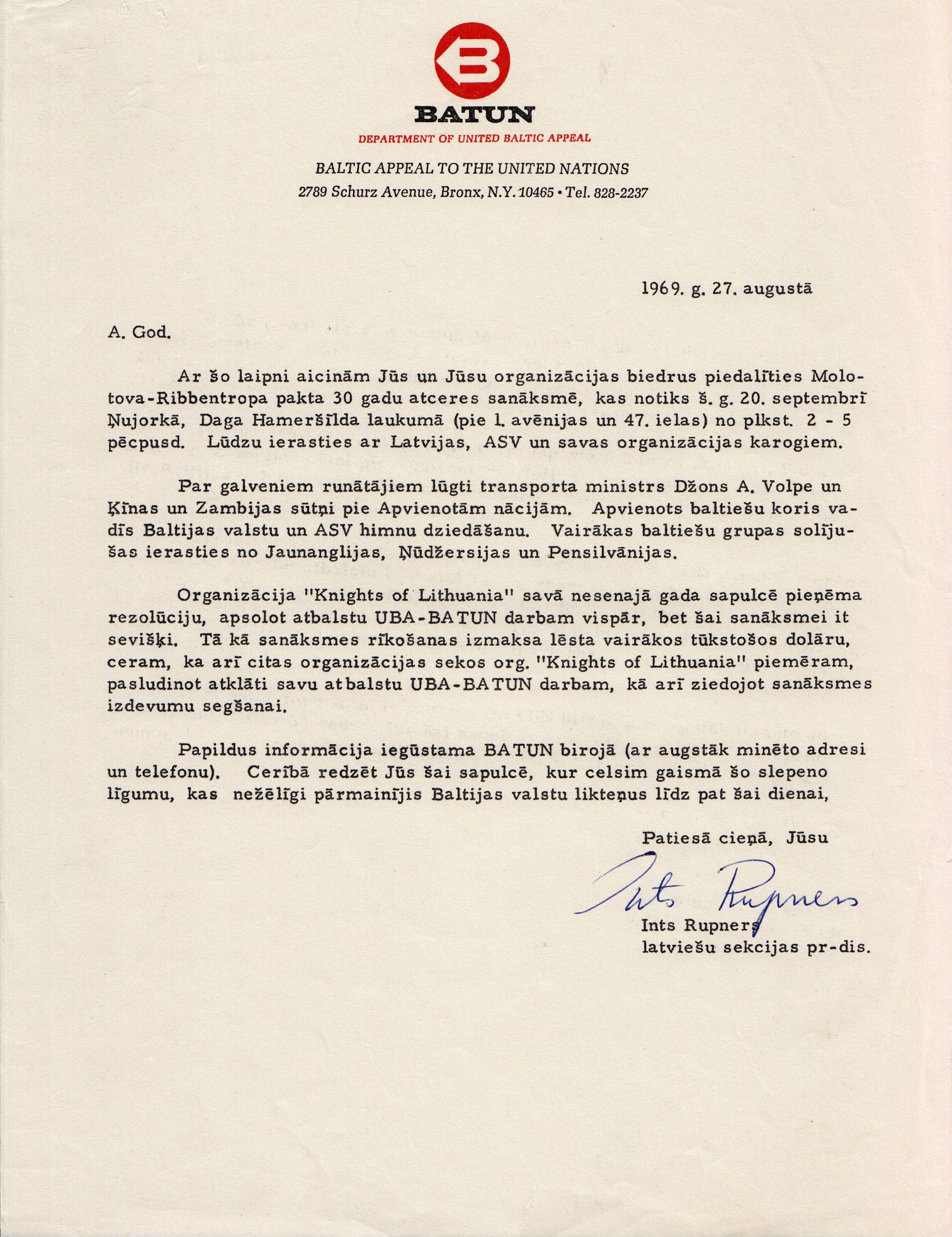 Invitation from Ints Rupners, Chairman of the BATUN Latvian Group, to participate in the rally commemorating the 30th anniversary of the Molotov-Ribbentrop Pact. Source: LNA LVA F.2944.