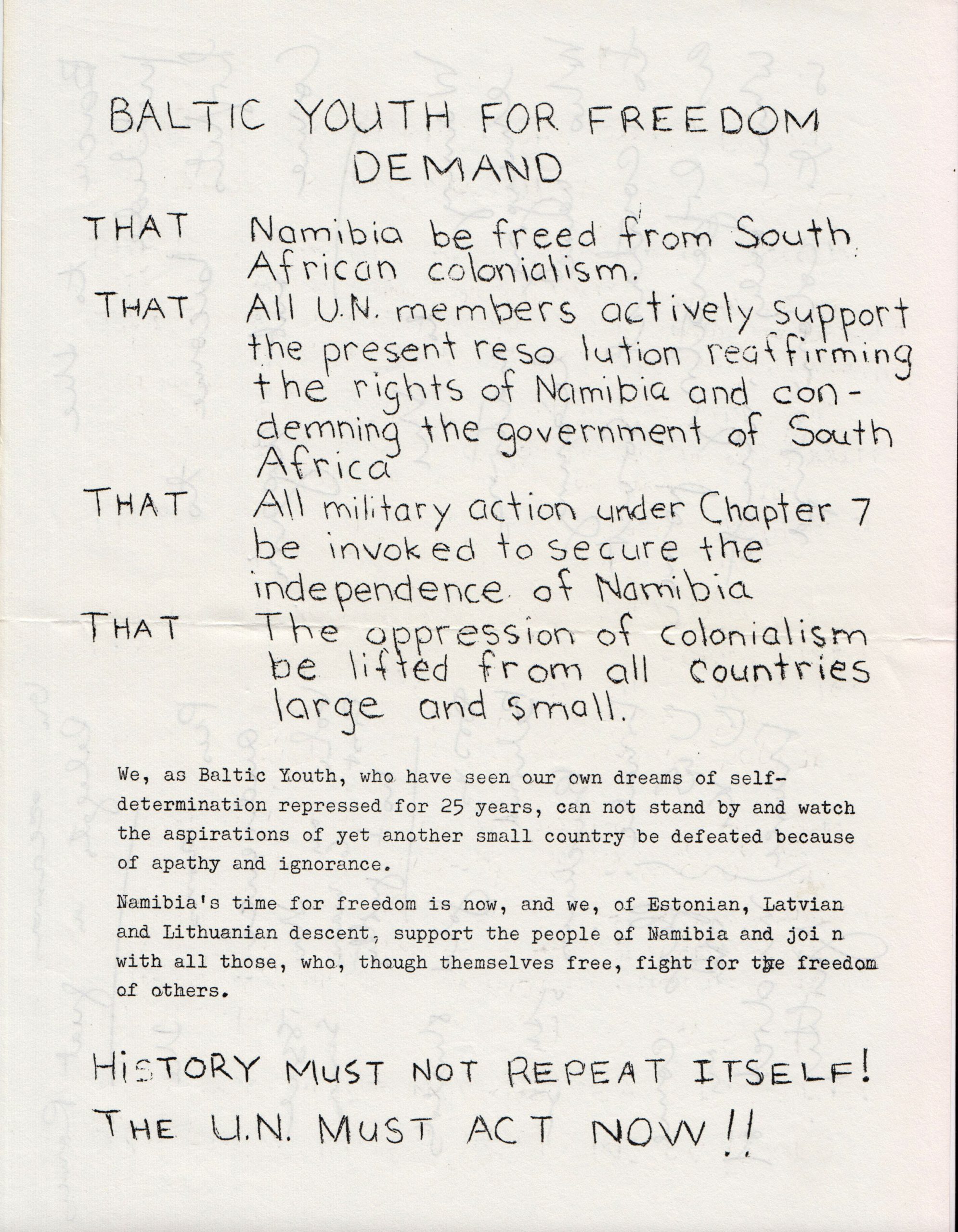 Support for Namibian independence was a great opportunity for the Baltic Youth for Freedom (BYFF’s) first demonstration in 1968. The demonstration typified BYFF’s approach to its public actions, which were designed  to attract attention and reinforce its message of all peoples’ right to self-determination.