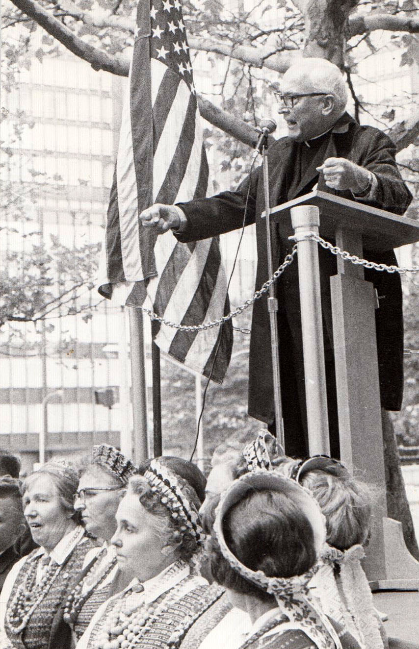 Congressman Mario Biaggi (24th Congressional District of New York) addressing the Baltic rally commemorating the Molotov-Ribbentrop pact. Photo by Charles Binkins. Source: LNA LVA F.2944.