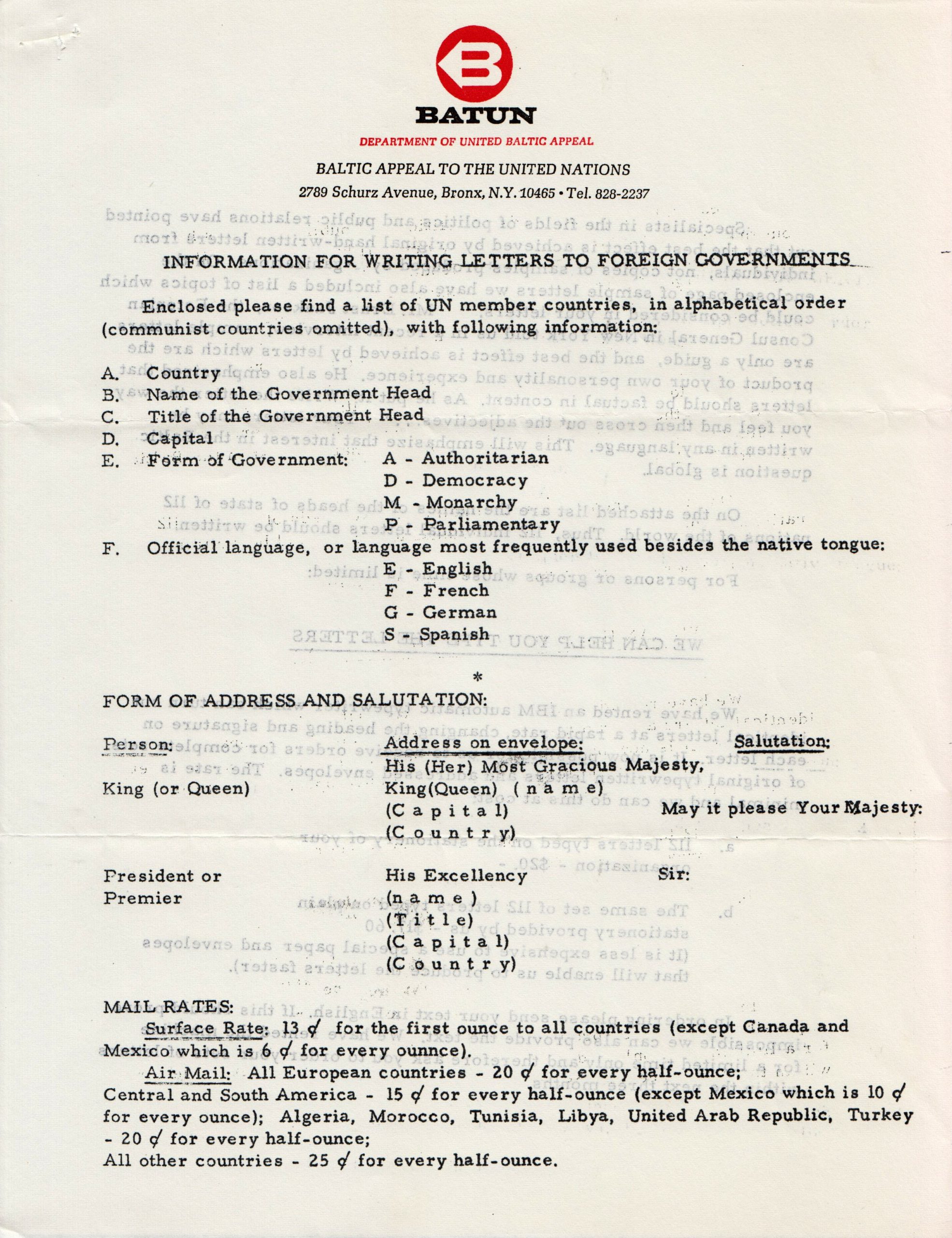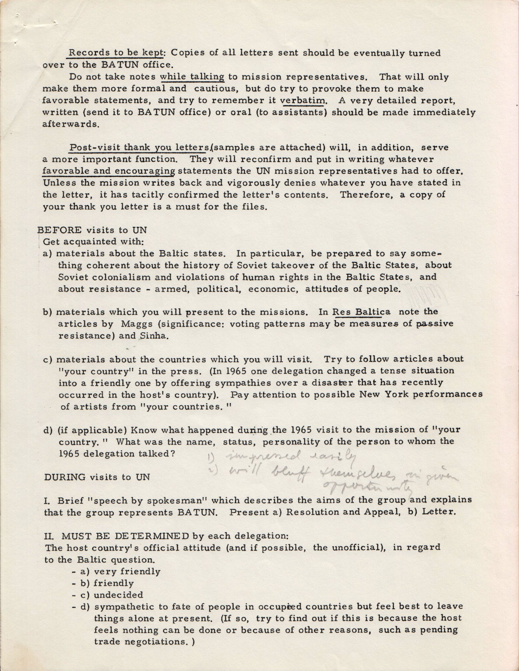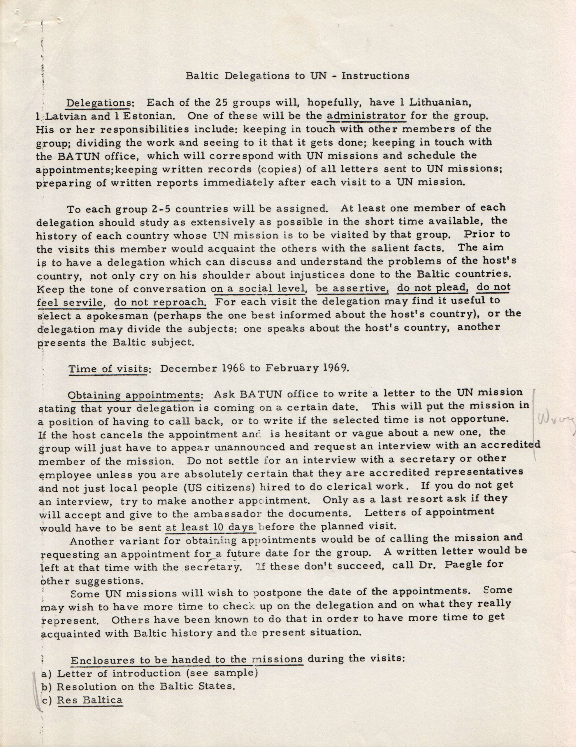 The main tool of BATUN was visiting the permanent missions of the UN Member States in New York. The visits played a special role in 1968 when they were part of the activities related to the 50th anniversaries of the proclamation of the independence of Estonia, Latvia, and Lithuania. The original idea was to create ten two-person, bi-ethnic delegations to undertake 15-20 missions to be backed and financed by Baltic exile organizations. The campaign took about two years. In June 1968 the BATUN Annual Meeting authorized the visits. They began on 23 December 1968 and lasted into the summer of 1969. By that time 86 permanent missions had been visited or had materials mailed to them. In 39 of the permanent missions, the heads of the mission – ambassadors or the chargés d’affaires – received the BATUN delegations. About ninety people had been recruited to make the visits, but only sixty actually participated. In late 1968, the delegates were provided about fifty pages of instructional materials and samples of the materials to be presented during the visits. After each visit, the members of the delegation would fill out a report on the visit and send a thank-you letter to the host.