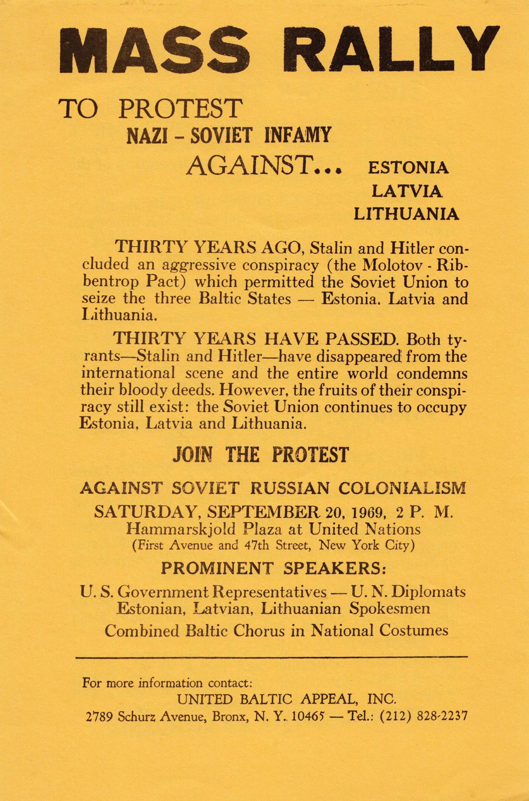 1969 marked the 30th anniversary of the infamous Molotov-Ribbentrop pact between Stalin and Hitler that divided Eastern Europe into two spheres of interest. During a meeting on March 3, 1969, the BATUN board decided that this event would be the focus of the organization’s protest activities for that year. The plan was to stage a rally called Day of Concern on September 20, 1969 at the UN headquarters in New York. In the days prior to the rally, BATUN members distributed leaflets in midtown Manhattan. However, only about 500 people attended the rally. The participants approved a resolution condemning the Soviet Union and calling upon the member states of the UN to call upon the Soviet Union to cease its occupation of the Baltic States. A local NY TV station reported on the rally, but otherwise it attracted little attention in the mainstream media.
