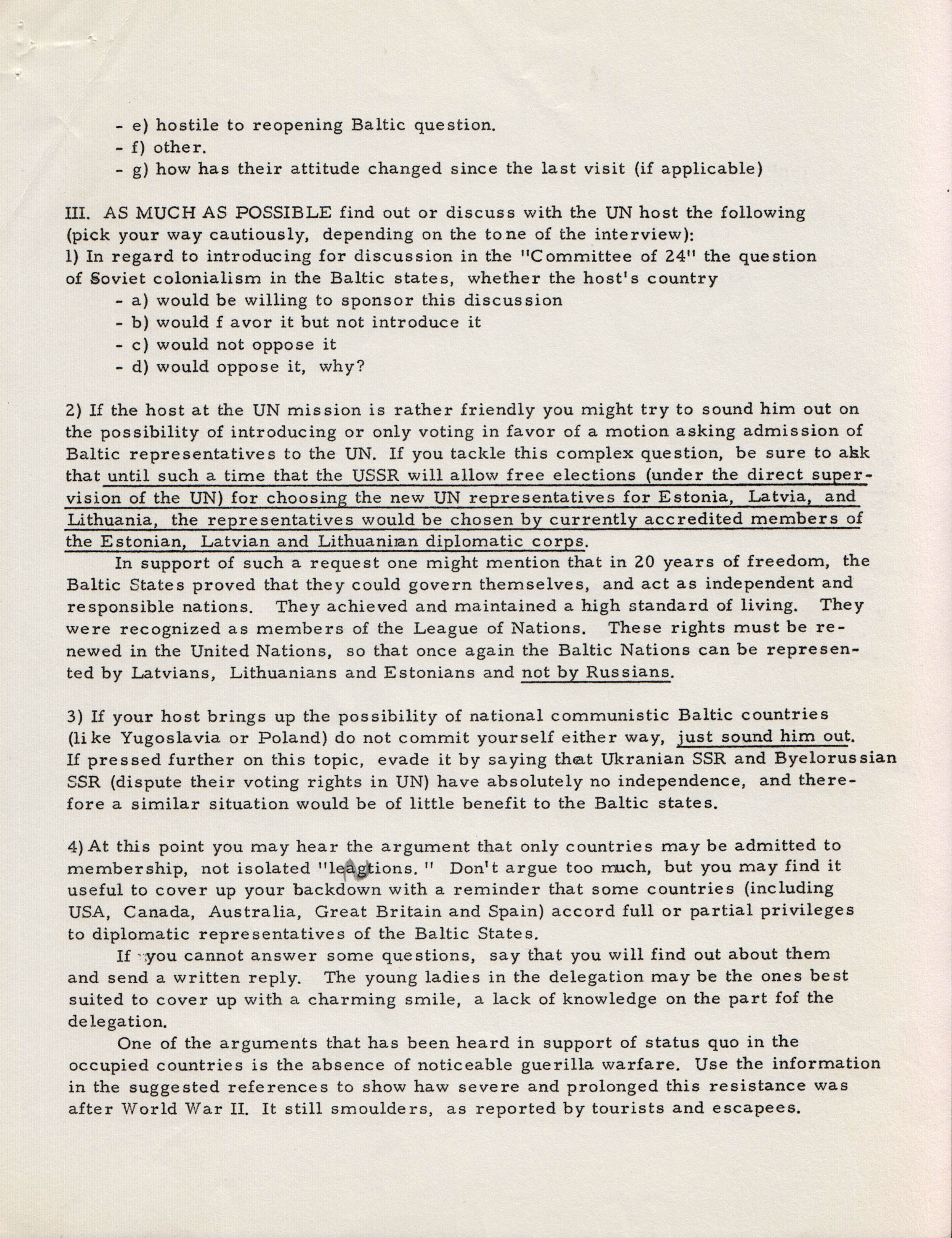 Instructions for the Baltic delegations to UN during the period from December 1968 to February 1969. Source: LNA LVA F.2944: