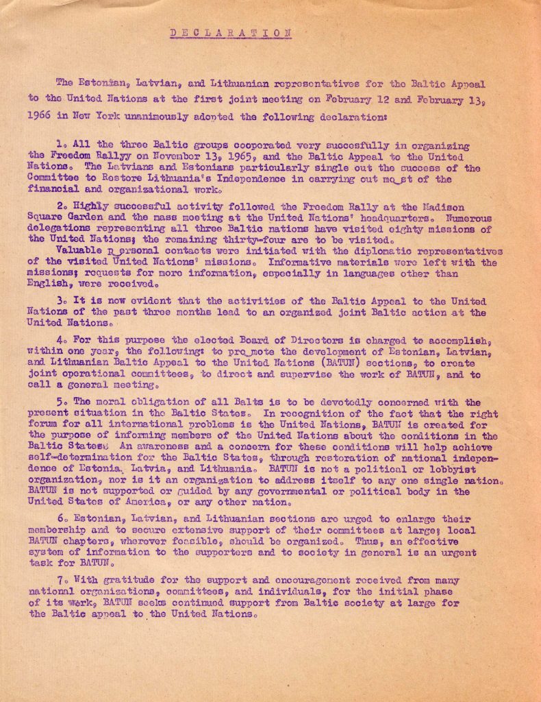 BATUN was founded on February 12 and 13, 1966 in New York by the Joint Baltic Conference. The declaration, which was voted on by the Estonian, Latvian and Lithuanian Committees of BATUN at the first joint meeting on February 12th and 13th, stated that BATUN is not a political organization, nor is it an organization that is addressing itself to only one nation. BATUN was opposed to all forms of imperialism, colonialism, and exploitation of one nation by any other. BATUN was not supported or guided by any governmental or political body in the US or any other nation. It was created for the purpose of informing the UN Member States about conditions in the Baltic States, in order to create serious concern in all freedom loving nations, based on the solemnly declared principles of the UN; and that this would lead to self-determination for the Baltic States, through the restoration of national independence for Latvia, Lithuania and Estonia. This was based on a moral obligation to be seriously concerned with the situation in the Baltic States, and the fact that the correct forum for the resolution of all international problems is the UN.