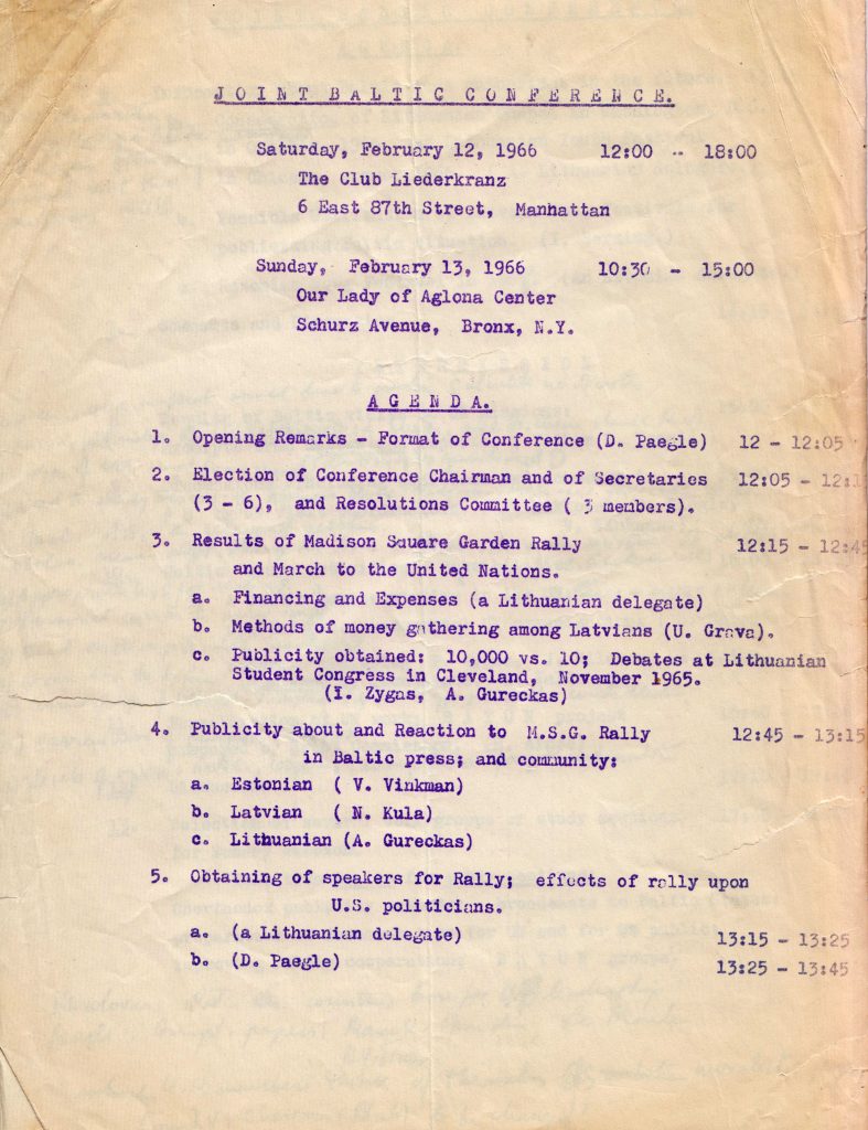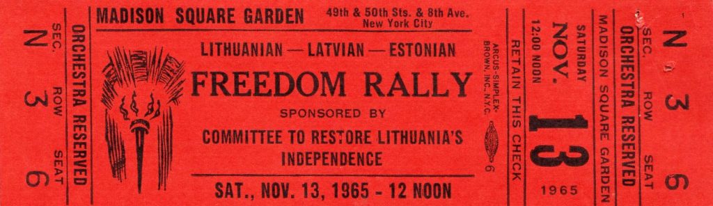 The rally was organized by exile Balts, mostly Lithuanians, who also raised the necessary funds. They were volunteers, mostly in their twenties and early thirties, graduates of American universities, and professionals who were engaged in pursuing their careers as well as volunteering in their ethnic communities. The main organizer was the Committee to Restore Lithuania’s Independence, incorporated in the State of New York, headed by Anthony Mazeika, Msgr. Balkunas, Algirdas Budreckis, Anthony Snieckus, Joseph Miklovas, and Romas Kezys. The rally was fully financed by the Baltic exiles. The organizers of the rally succeeded in raising about $65,000 from the Baltic exile community, mostly from Lithuanians.