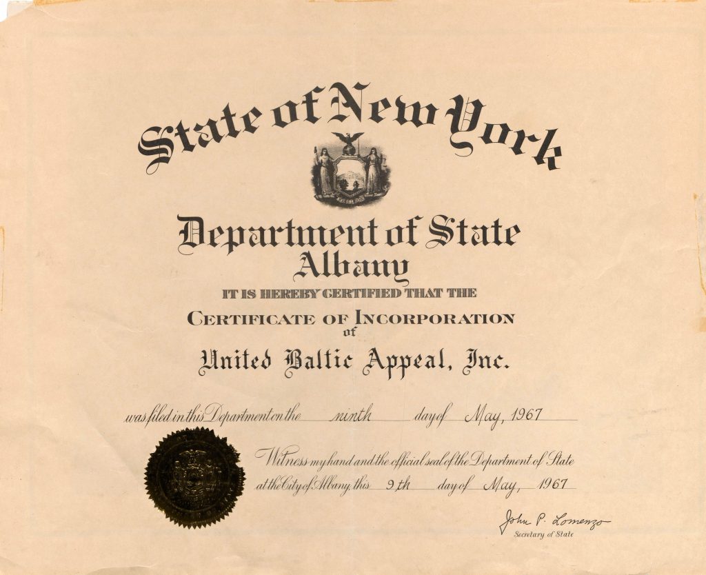 BATUN’s certificate of incorporation was filed in New York State on May 9, 1967. Originally, the intention was to incorporate the organization under the name “Baltic Appeal to the United Nations” which was based on a document with the informal title Baltic Appeal to the United Nations that was adopted at the rally held on November 13, 1965 in New York City. However, the non-profit organization was registered in New York State under the name United Baltic Appeal, Inc. since the organization could not incorporated the words “United Nations” in its name, if that organization is not officially connected to the UN. And BATUN was not. Due to the USSR’s objections, BATUN could not be accredited by the UN as a non-governmental organization. The press of the Baltic Soviet republics also clearly demonstrated a negative attitude towards BATUN. Therefore, the organization was incorporated under the name “United Baltic Appeal, Inc.” (UBA), and the acronym BATUN was considered to be a department of the UBA. However, most people continued to call the organization BATUN.
