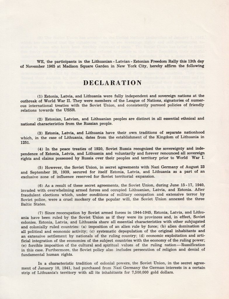 However, the most important moment was the declaration adopted by the meeting, in which an appeal was made to the United Nations leadership and individual governments to discuss the problem of colonialism in Estonia, Latvia and Lithuania without delay, and a demand was made that the Soviet Union grant these countries independence. The 128 prominent signatories of declaration included Richard M. Nixon (former Vice-President and future President of the United States), fifty-four US Senators and Representatives, seven state governors, six mayors of major cities, and nineteen members of the clergy. On Sunday, November 7, 1965 the signed declaration and an announcement of the rally appeared as a full-page ad in The New York Times.