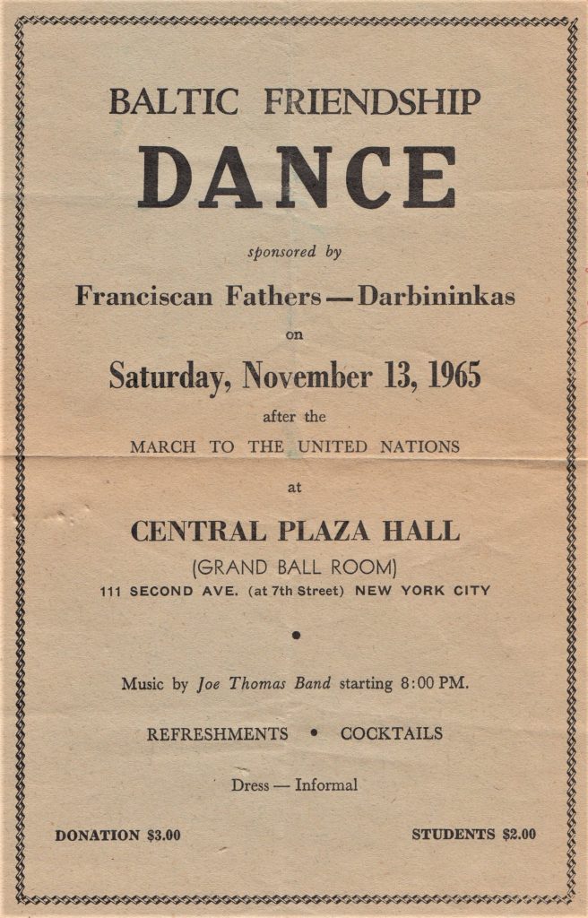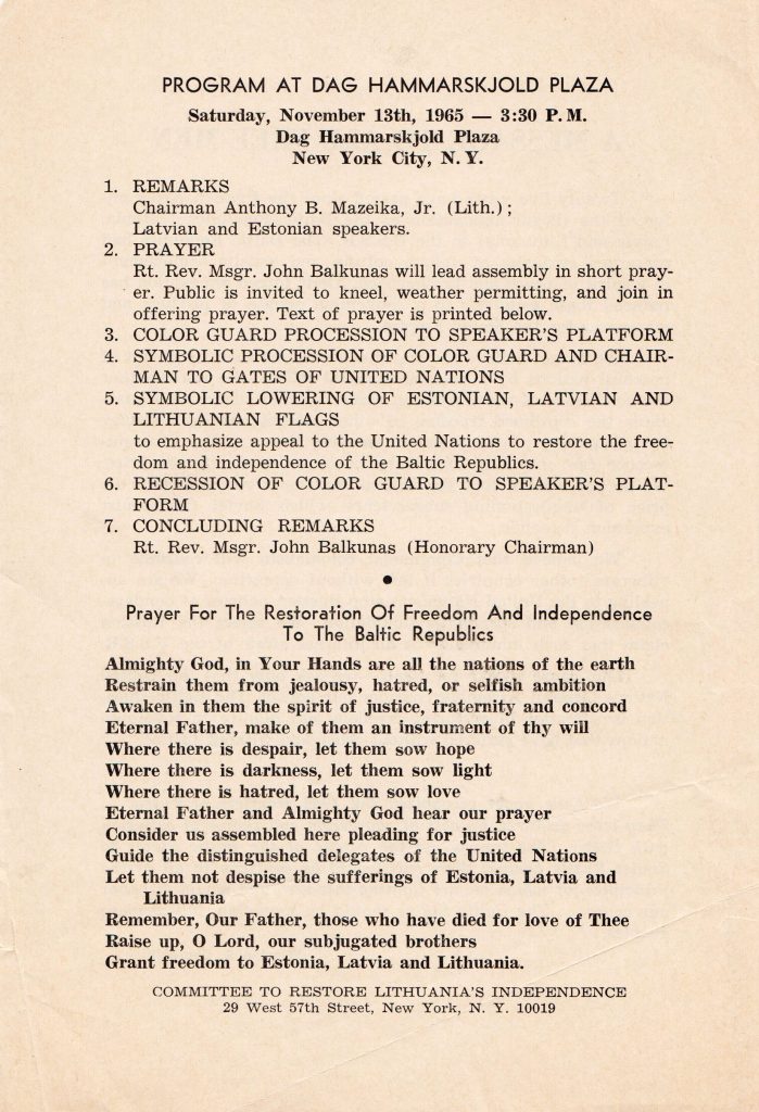 With this event, the Committee to Restore Lithuania’s Independence aimed to appeal to the United Nations for the restoration of the independence of the Baltic States by garnering the attention and support of the American public, and ensuring that the ‘Baltic Question’ is included in the agenda of the UN General Assembly for discussion and action – either directly or via the Decolonization Committee. During the Baltic demonstration in New York on November 13th, A. Mažeika, Chairman of the Lithuanian Independence Committee, pointed out that this also served to remind the world of the 25-year occupation of the Baltic States, and that the crimes of the Soviet Union needed to be investigated.