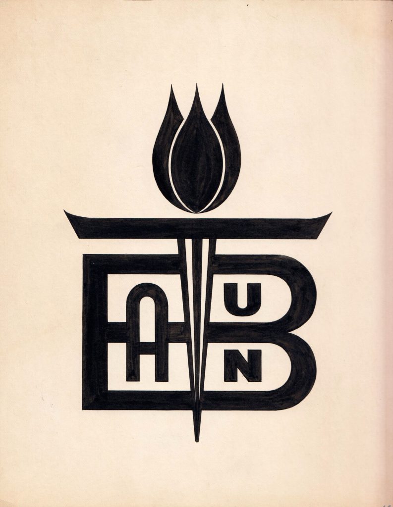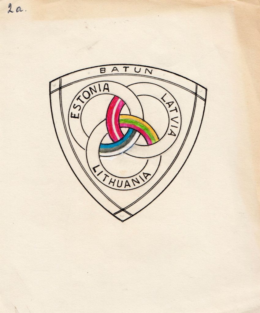 After BATUN was established, the question of the organization’s visual identity arose. In 1966, BATUN announced a competition in the exile press for a logo design that would symbolize the organization’s mission and could be used in print and elsewhere. The logo had to be symbolic and easy to replicate. A monetary prize was announced and artists were invited to submit their ideas. The invitation generated a great deal of interest in the Baltic exile media. Sixty-nine designs from 22 Baltic artists in the US, Canada, Australia and Europe were submitted. Representatives of Baltic organizations and the Ambassador of South Vietnam to the UN were chosen as the jury. On January 28, 1967, BATUN chose Latvian artist Ilmārs Rumpēteris’s design as its logo. The BATUN logo is a stylized letter B (comprised of a backwards number three and arrow pointing westward in a field of red) and symbolizes the unified effort of the three Baltic states to escape from the Soviet occupation that encircles them.