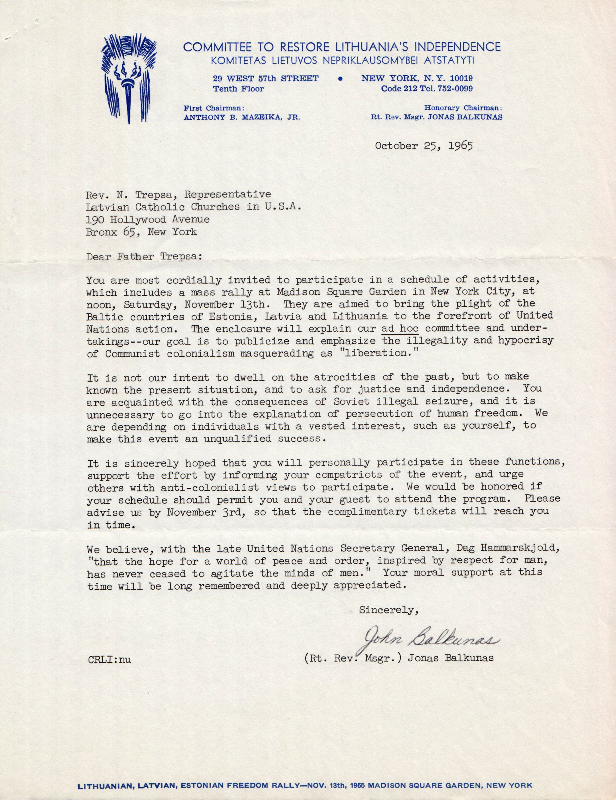 “May the Freedom Rally in New York be only the beginning of a large and unceasing effort of all Latvians, Lithuanians, and Estonians, now living in the free world to liberate their native countries”