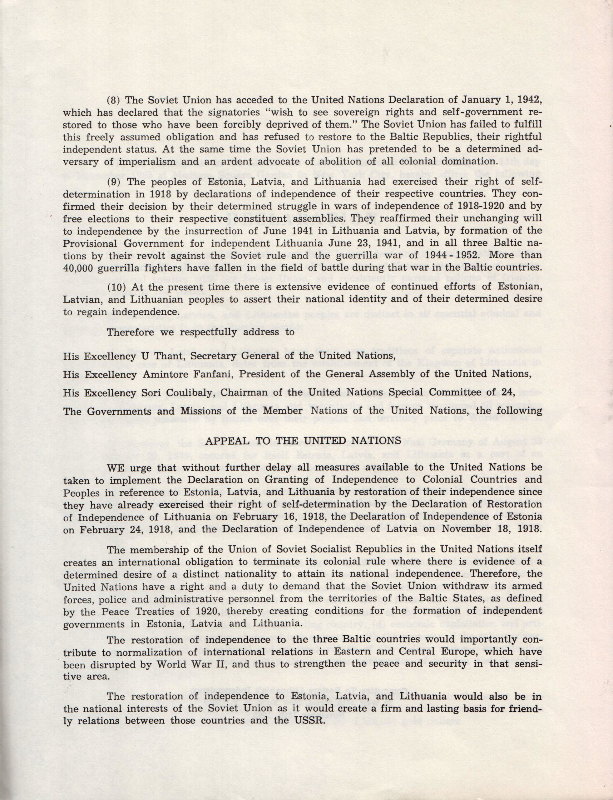 However, the most important moment was the declaration adopted by the meeting, in which an appeal was made to the United Nations leadership and individual governments to discuss the problem of colonialism in Estonia, Latvia and Lithuania without delay, and a demand was made that the Soviet Union grant these countries independence. The 128 prominent signatories of declaration included Richard M. Nixon (former Vice-President and future President of the United States), fifty-four US Senators and Representatives, seven state governors, six mayors of major cities, and nineteen members of the clergy. On Sunday, November 7, 1965 the signed declaration and an announcement of the rally appeared as a full-page ad in The New York Times.
