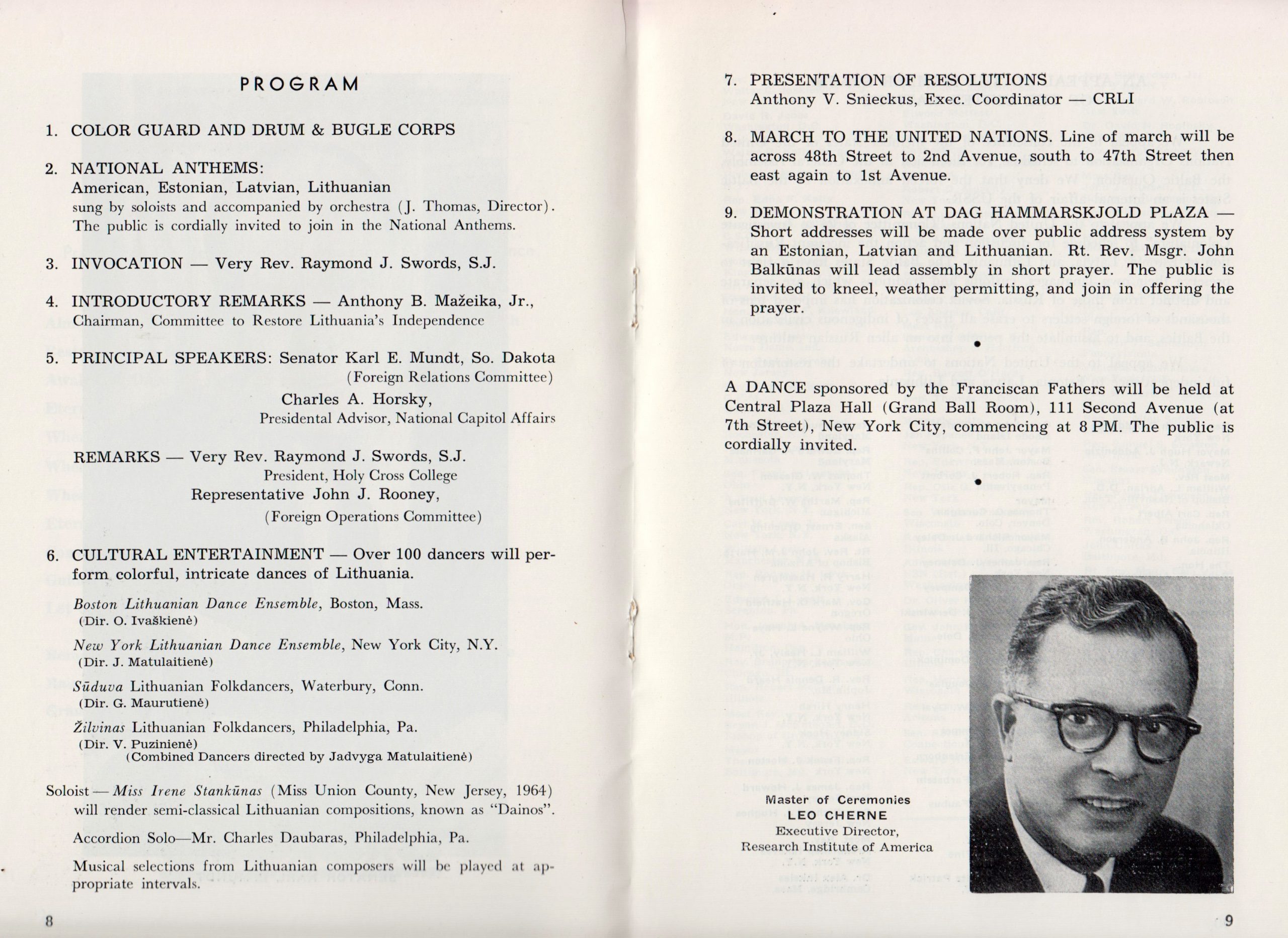 Two mass meetings were organized as part of the demonstration. The first mass meeting took place in the 18,000-seat Madison Square Garden arena (on 8th Avenue between 49th and 50th Streets) in Manhattan with the participation of American statesmen and a promise of support for the Baltics. The program director, Leo Cherne, a prominent American and executive director of the Research Institute of America, read a declaration by New York City Mayor Robert F. Wagner Jr. announcing that November 13th had been declared to be Baltic Freedom Day in New York City. Senator Karl E. Mundt, a member of Foreign Relations Committee, and Congressman John J. Rooney, a member of Foreign Operations Subcommittee, promised to work for the adoption of a program to support the efforts of oppressed people to achieve freedom in the US Congress and to discuss what US government could done for the Baltics.