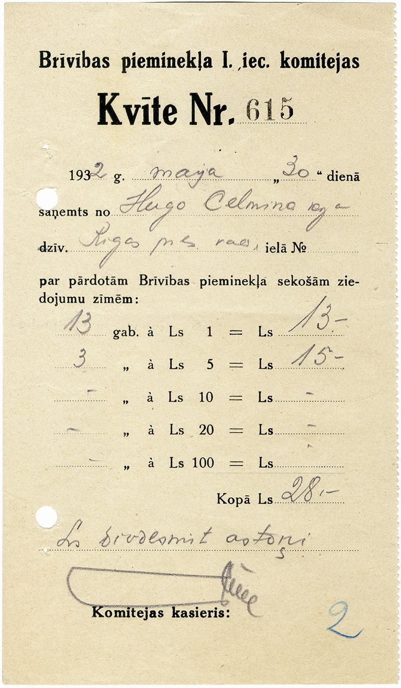 13. Brīvības pieminekļa 1. iecirkņa komitejas ziedojumu kvīts. Ziedojums saņemts no Rīgas pilsētas galvas Hugo Celmiņa 1932. gada 30. maijā.