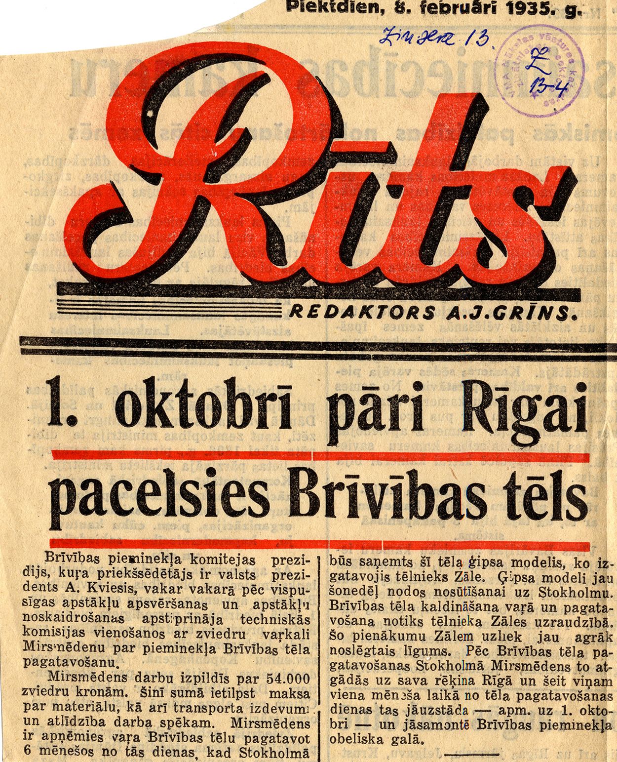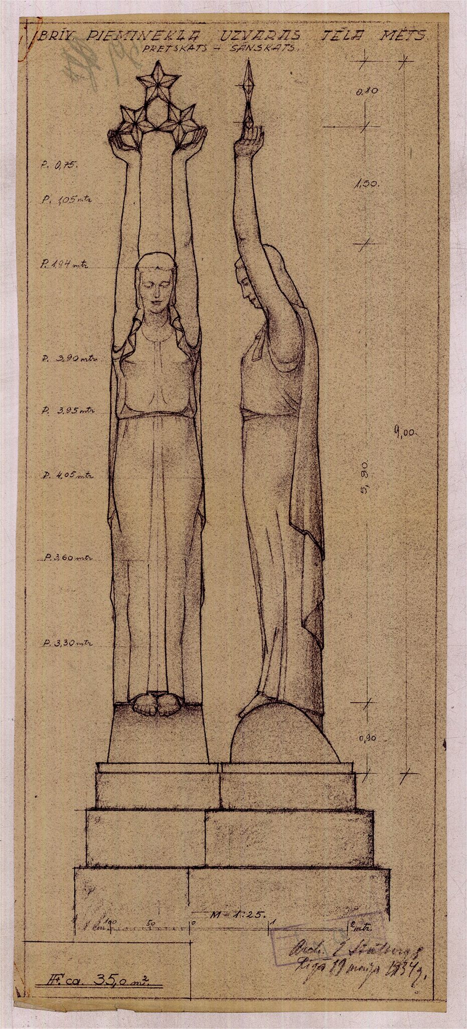 3. Brīvības pieminekļa Uzvaras tēla mets. Pretskats, sānskats. 1934. gada 19. maijs.