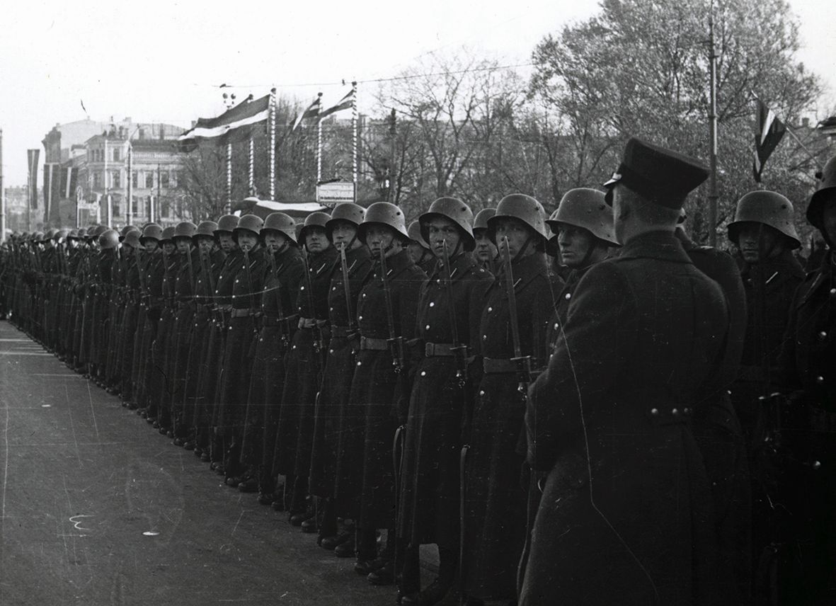 2. Karaspēka ierindas, kas izvietotas pie Brīvības pieminekļa atklāšanas ceremonijas laikā.