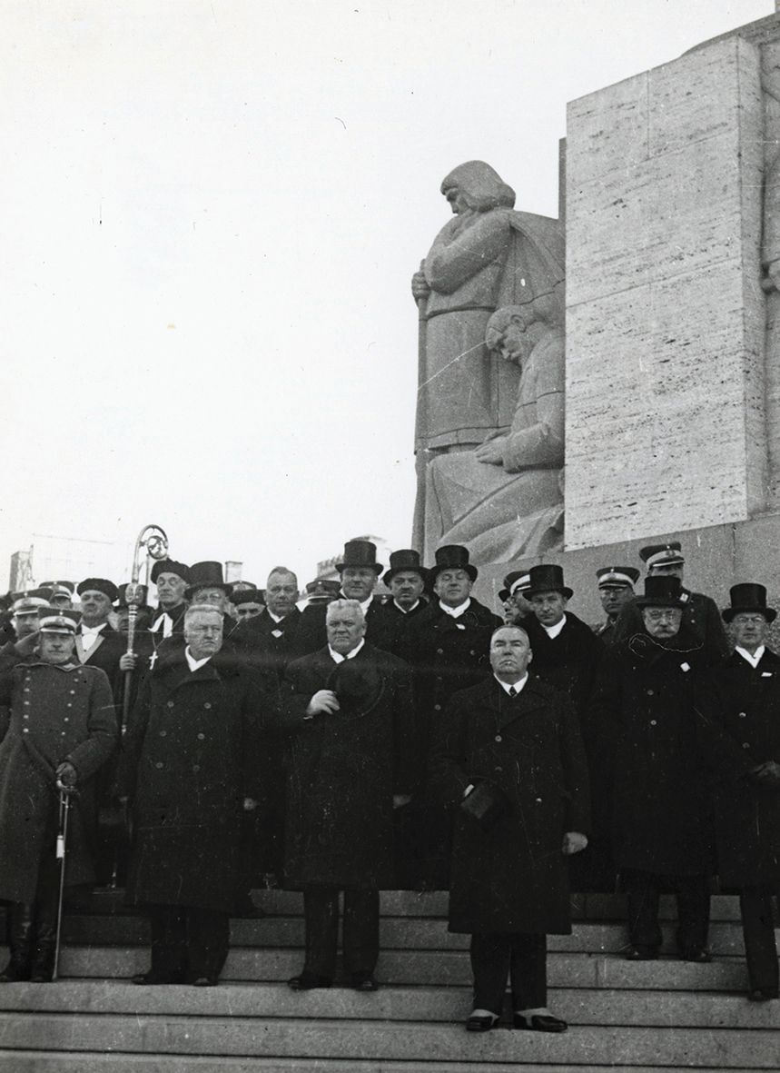 4. Krišjānis Berķis, armijas komandieris; Jānis Balodis, kara ministrs; Kārlis Ulmanis, Valsts prezidents un Ministru prezidents Alberts Kviesis Brīvības pieminekļa atklāšanas ceremonijā.