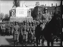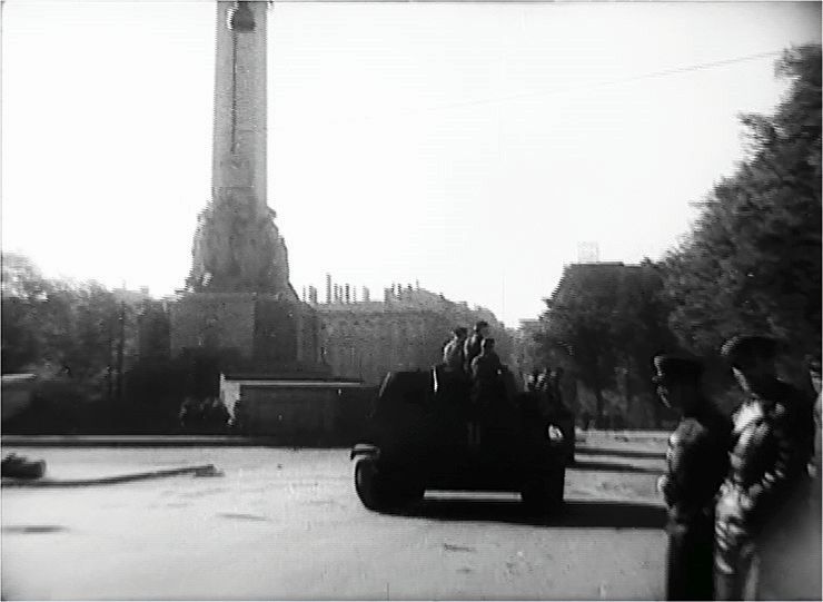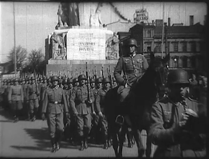 5. Nacistiskās Vācijas karavīri soļo pie Brīvības pieminekļa Rīgā. 1942. gads.