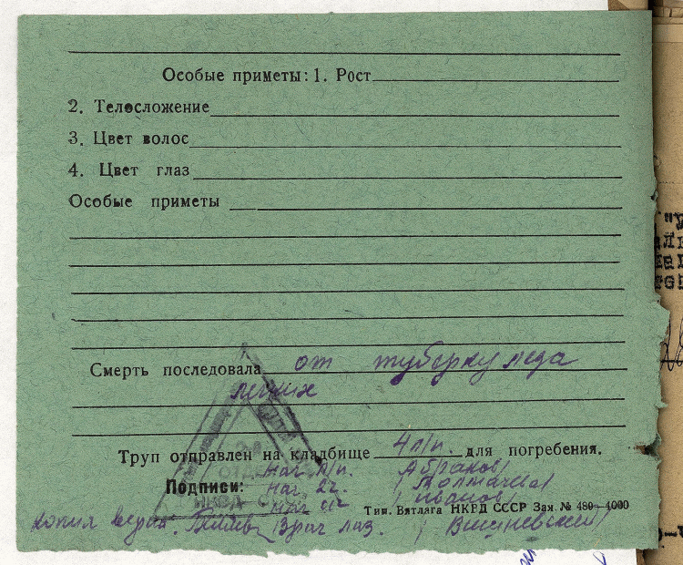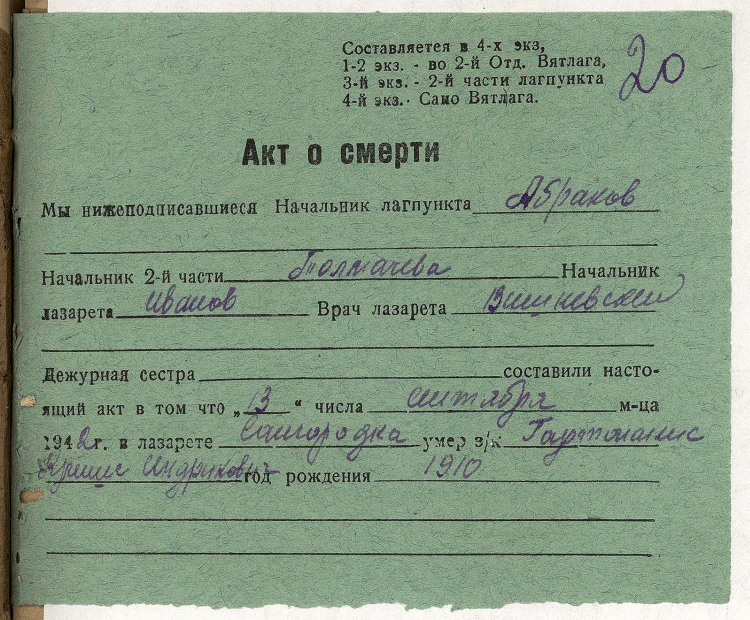 PSRS IeTK Vjatkas labošanas darbu nometnes 4. punkta priekšnieka, lazaretes priekšnieka un lazaretes ārsta parakstīts akts par Kriša Hartmaņa nāvi.