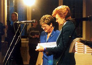Grāmatas „ Aizvestie. 1941. gada 14. jūnijs ” sagatavošanas darba grupa (no kreisās) Zigmunds Kārkliņš, Līga Strazdiņa, Iveta Šķiņķe, Aija Kalnciema, Jānis Riekstiņš, Inese Lase, Elmārs Pelkaus un Ainārs Bambals Latvijas Valsts prezidente Vaira Vīķe – Freiberga un LVA direktore Daina Kļaviņa grāmatas atvēršanas pasākumā.