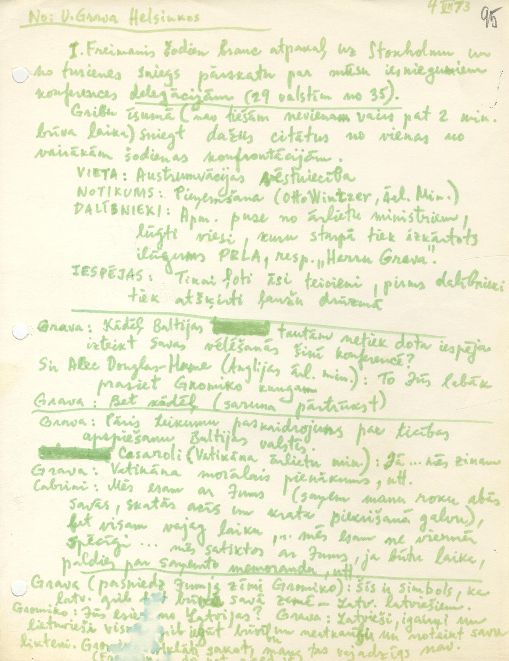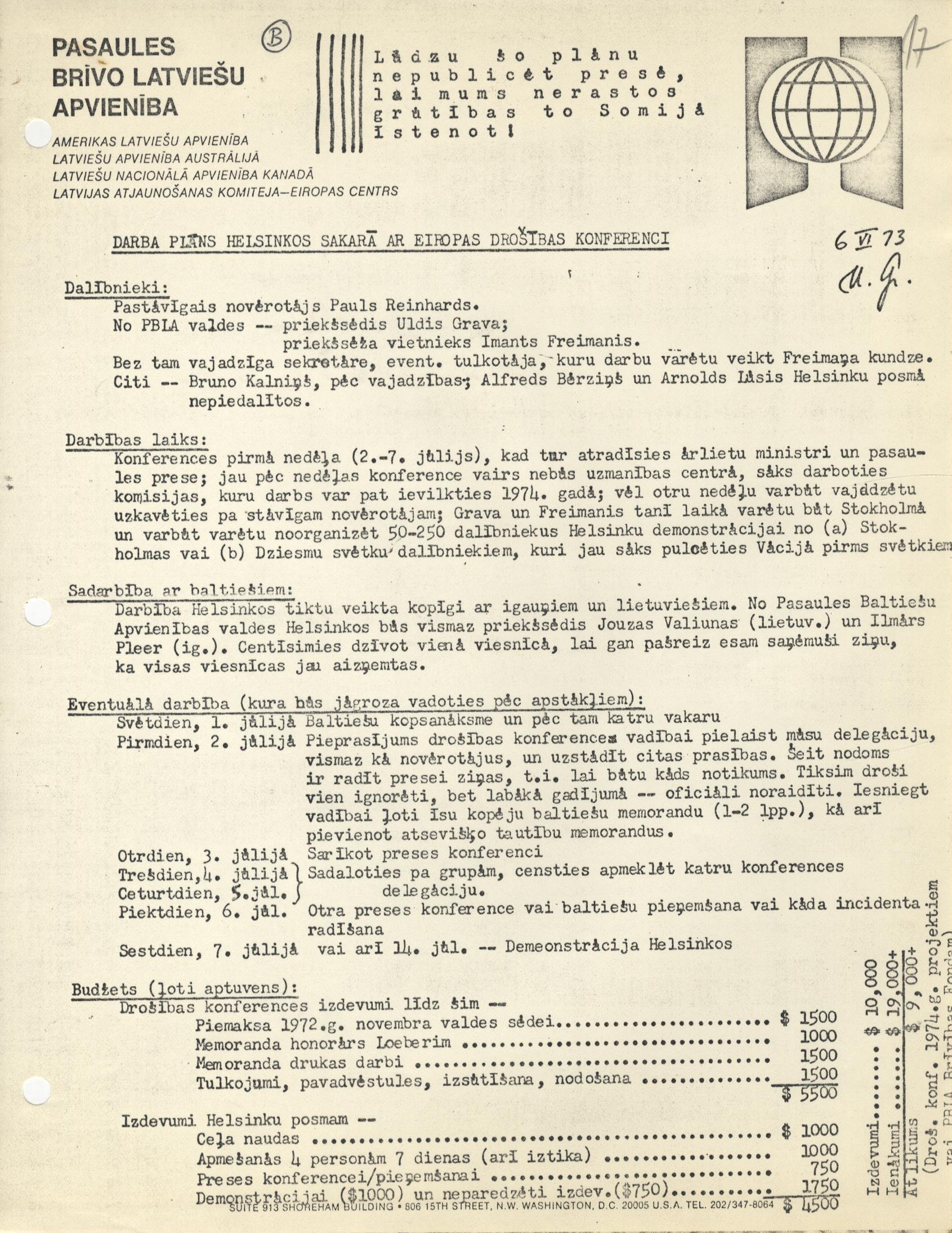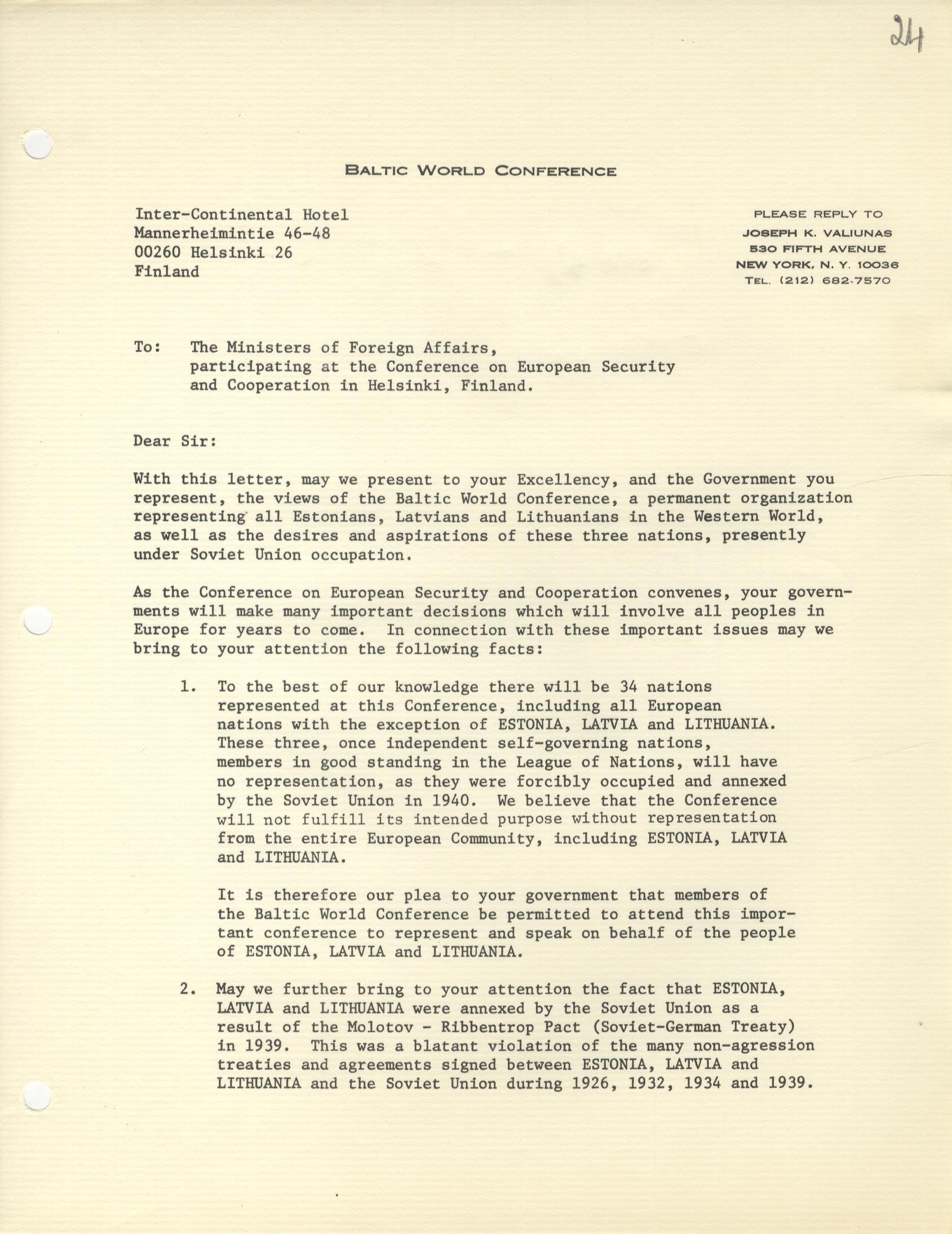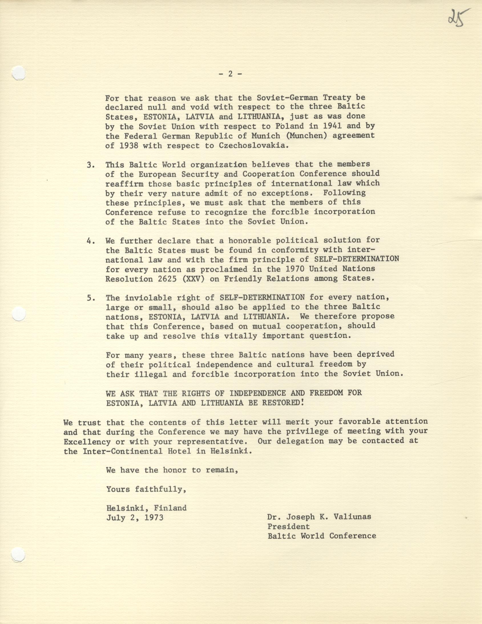 Kad 20. gs. 70. gados mazinājās starptautiskais saspīlējums, rietumvalstis un komunistisko valstu bloks meklēja ceļus dialogam. 1973. gadā Helsinkos notika konference EDSA nolīguma sagatavošanai. Bez daudziem citiem jautājumiem plānotais nolīgums apstiprinātu arī valstu robežu neaizskaramības principu, tādējādi faktiski atzīstot Baltijas valstu okupāciju.