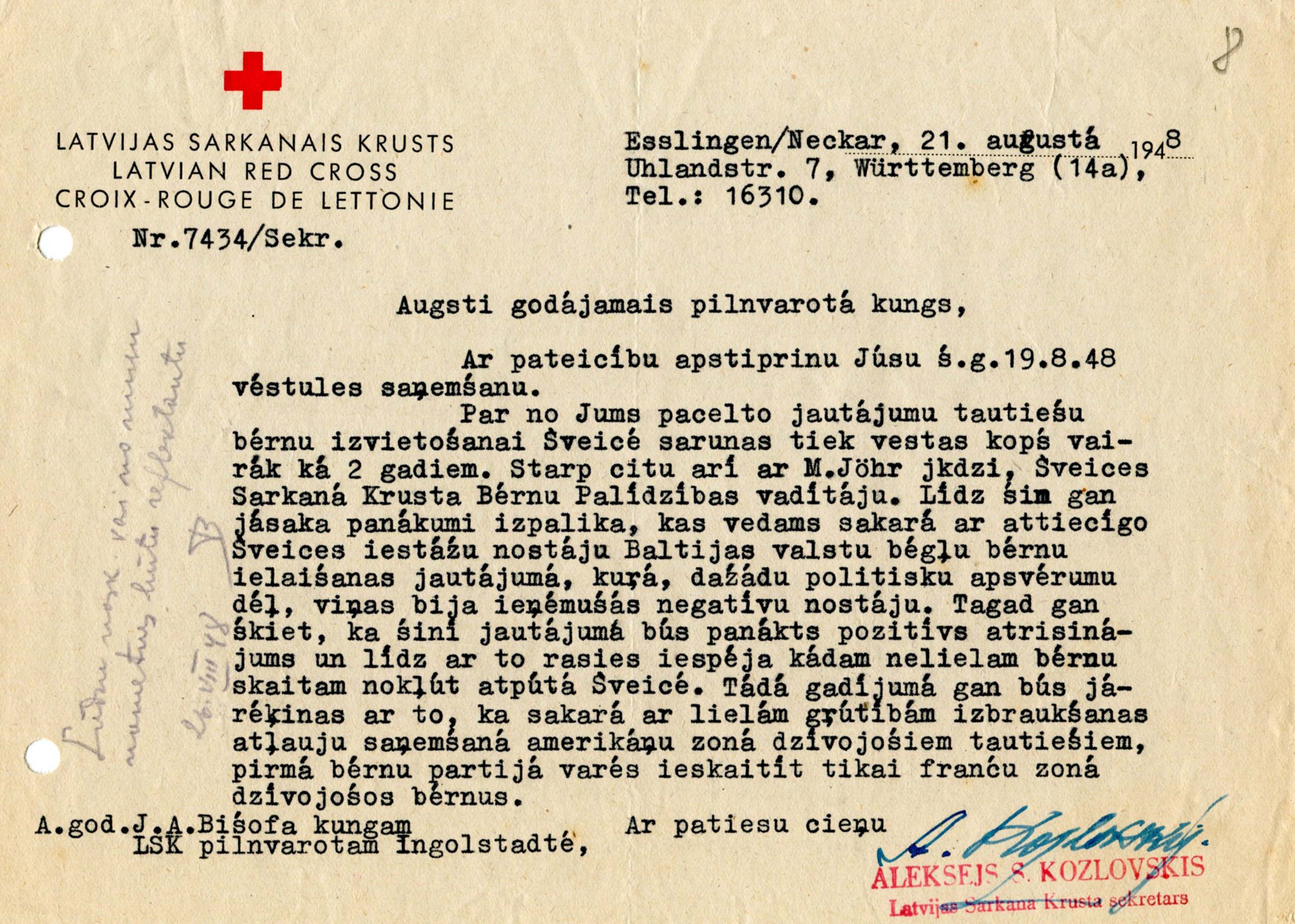 Letter from Latvian Red Cross secretary A. Kozlovskis. 21 August 1948.