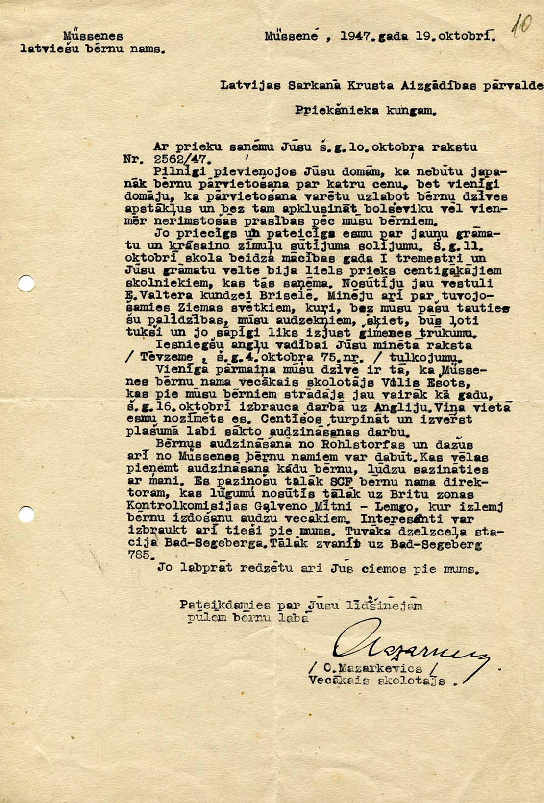 Letter from Müssen Latvian orphanage senior teacher O. Mazarkevics. 19 October 1947.