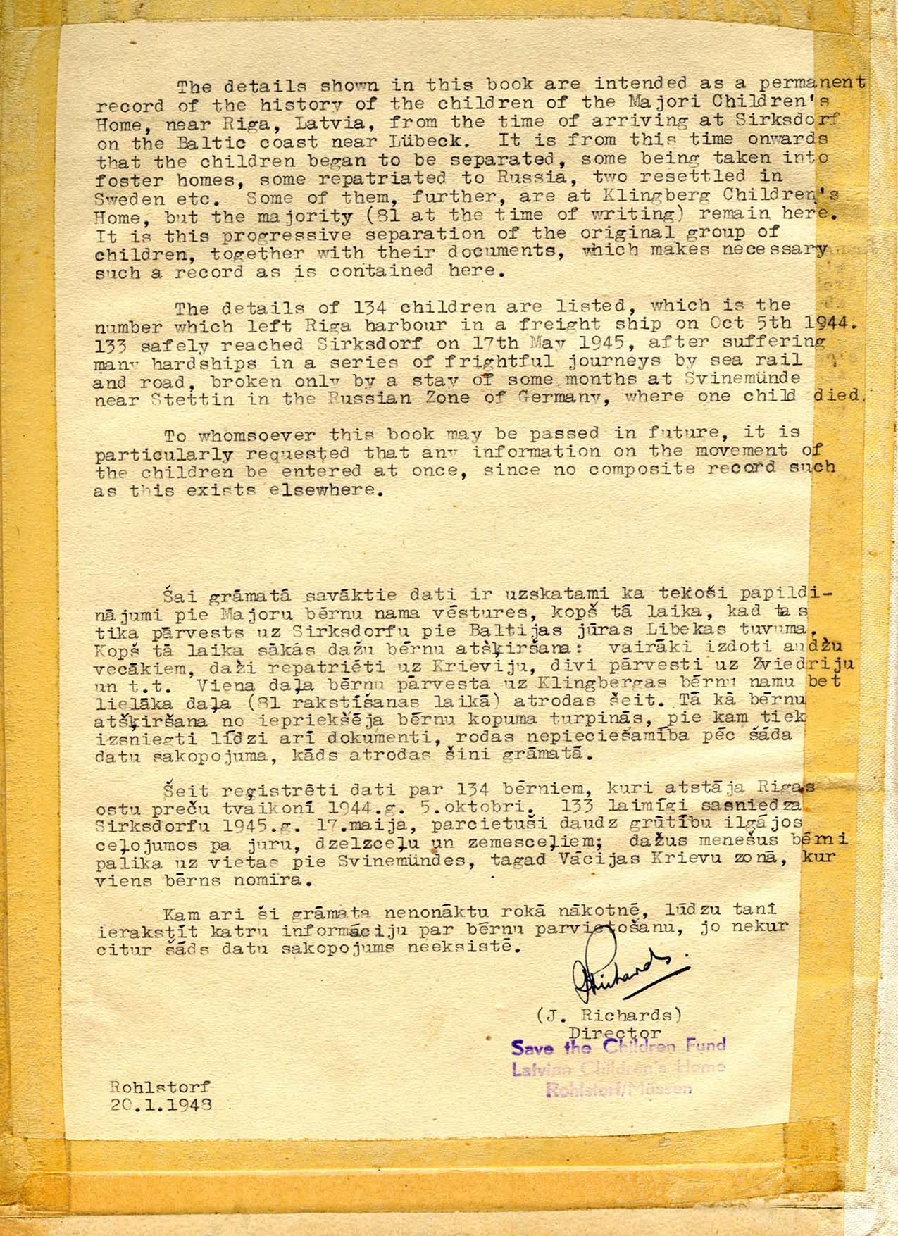 In the autumn of 1944, when military activities had already covered a large part of Latvia, the German public authorities ordered that children from the National Infants’ Orphanage of Riga and National Orphanage of Majori were evacuated to Germany. Initially they were placed in Swinemuende and Albeck, but in the spring of 1945 the National Infants’ Orphanage of Riga was moved to Hahnenklee in Harz Mountains, but National Orphanage of Majori was moved to Sierksdorf after a short stay in Rügen Island. Later children from this orphanage lived in Fisav, Malente, Rohlstorf and Klingenberg.