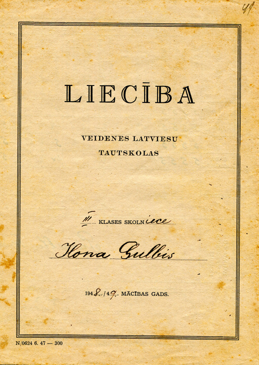 | Veidenes latviešu tautskolas liecība. 1949. gads. LVA, 2250. f., 2v. apr., 6. l., 41. lp. |