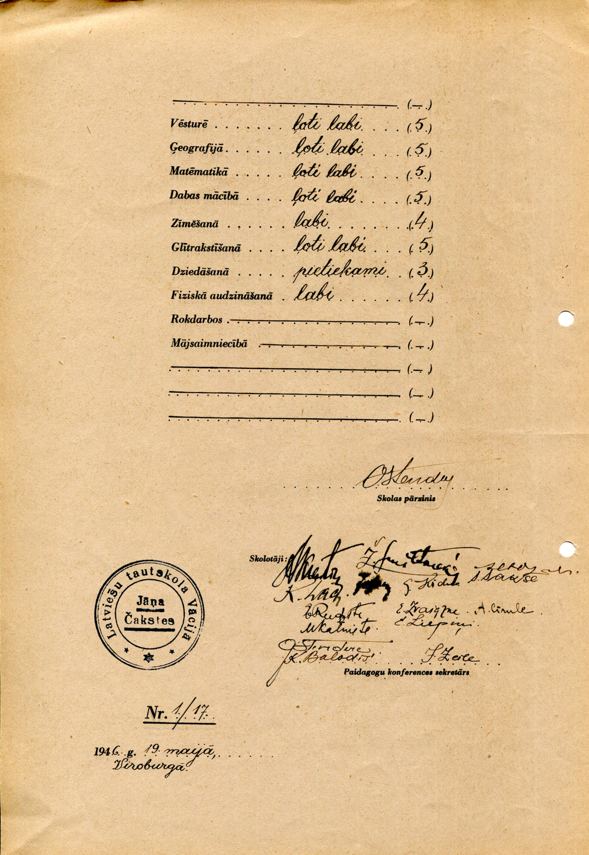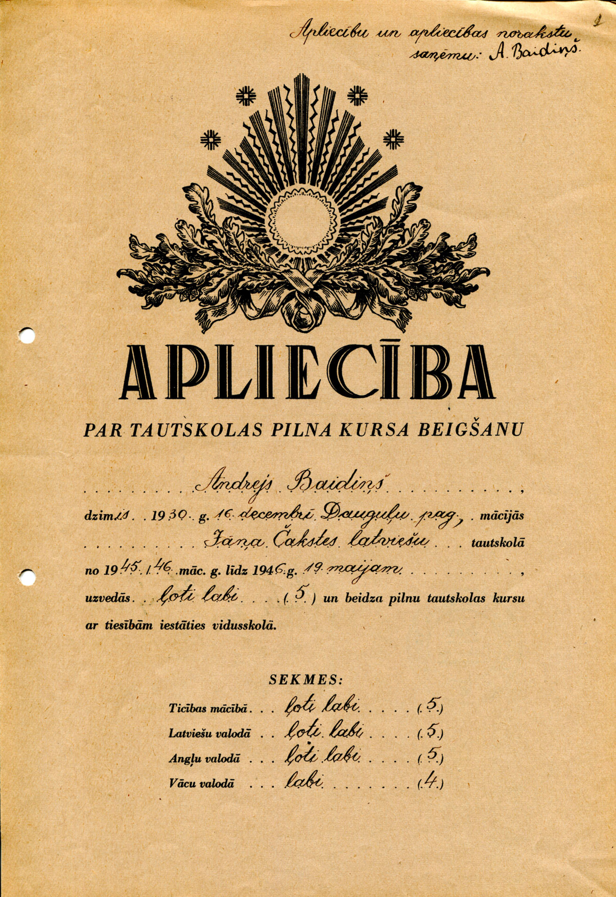 | Apliecība par J. Čakstes latviešu tautskolas pilna kursa beigšanu. 1946.gads. LVA, 2335. f., 1. apr., 111. l., 1. lp., 1. o.p. lp. |