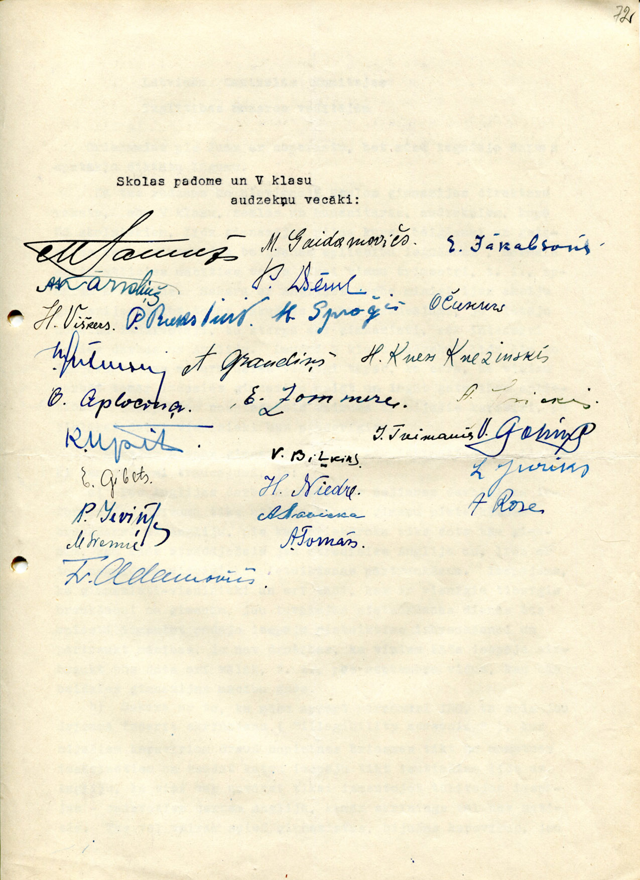 | "Saules" ģimnāzijas direktora un skolotāju ziņojums Latviešu Centrālās komitejas Izglītības nozares vadītājam. LVA, 2335. f., 1. apr., 97. l., 71., 72. lp. |
