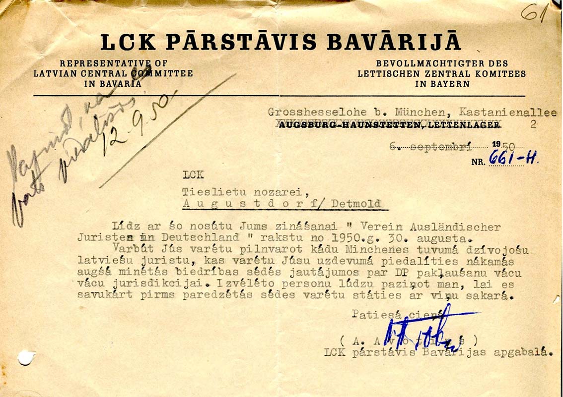 | LCK pārstāvja Bavārijā vēstule. 1950. gada 6. septembris. LVA, 2335. f., 1. apr., 81. l., 61. lp. |