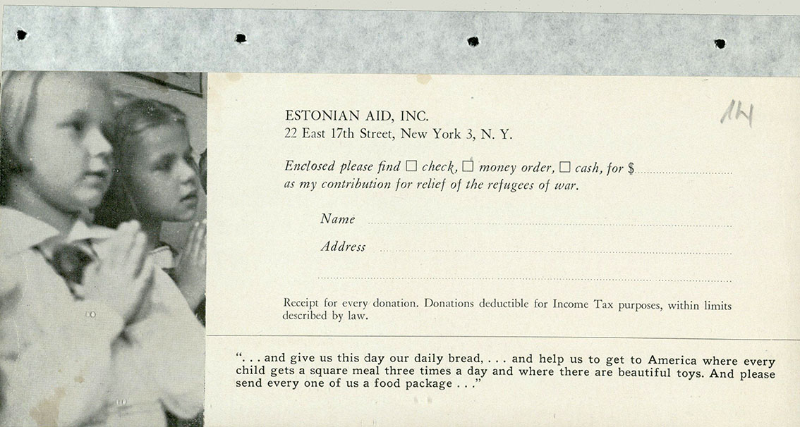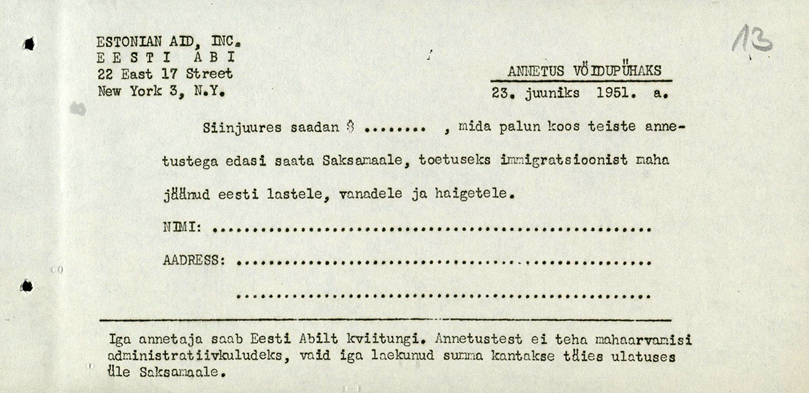 | New Yorgis tegutseva Eesti Abi korraldatava annetuste kogumise lehed. ERA.1622.2.61, lk 13–14 (digiteeritud, www.ra.ee/saaga) |