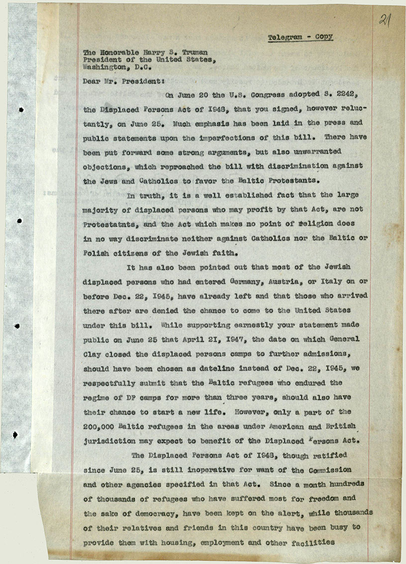 | Eesti Abistamise Komitee pöördumine Ameerika Ühendriikide presidendi Harry S. Trumani poole. 24. juuli 1948. ERA.1622.2.61, lk 21–22 (digiteeritud, www.ra.ee/saaga) |
