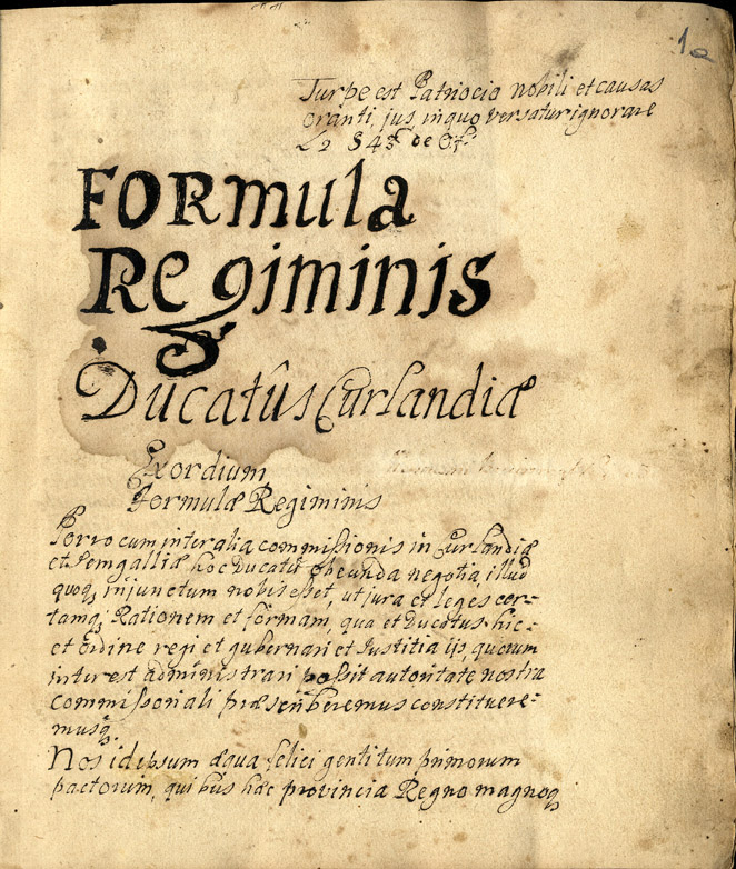 6. The constitution of the Duchy of Courland “Formula Regiminis”. Proclaimed in Mitau/Jelgava, 18 March 1617. Title page. LVVA, Collection 640, Inventory 3, File 630.