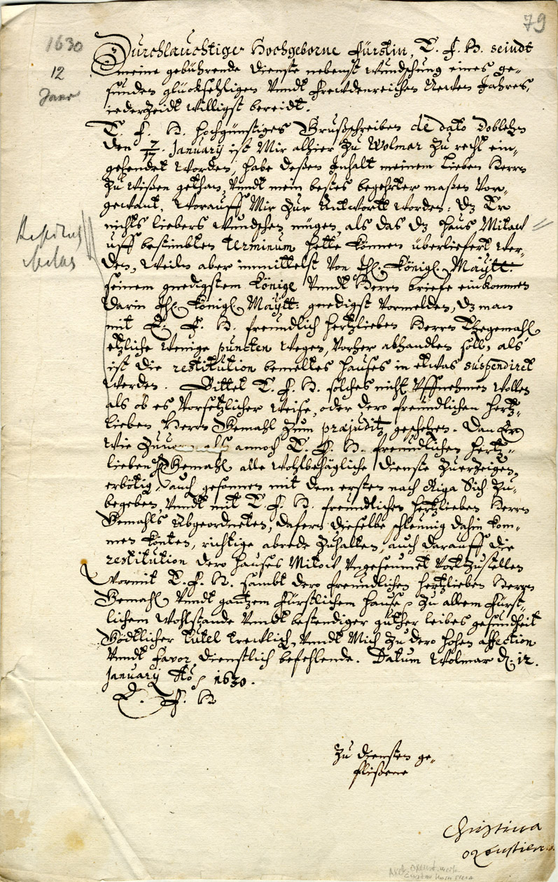 8. Letter from Kristina Oxenstierna to Elisabeth Magdalena. Wolmar/Valmiera, 12 January 1630. LVVA, Collection 1100, Inventory 13, File 722, Volume I.