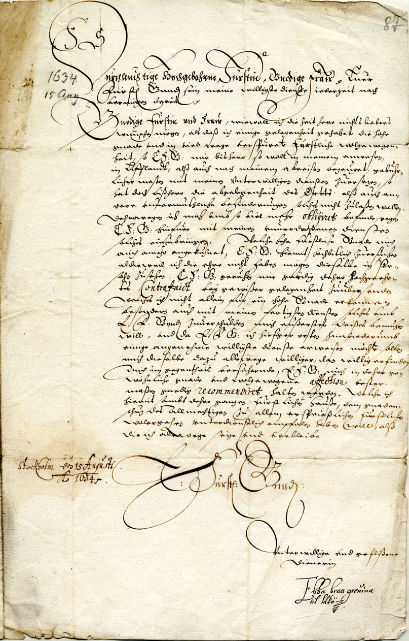 9. Letter from Ebba Brahe to Elisabeth Magdalena. Stockholm, 15 August 1634. LVVA, Collection 1100, Inventory 13, File 722, Volume I.