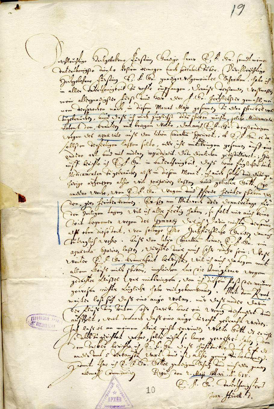 Hövelius was a medical doctor and natural scientist, who was born in Holland and had studied in Leiden, and in 1631 had moved to Riga. He had been the Riga city doctor, a teacher at the Riga Dom Grammar School and the duchess's court doctor. In the letter he writes that he will soon be visiting the duchess and bringing the required medication, and will teach her to make a special infusion from mayflowers.
