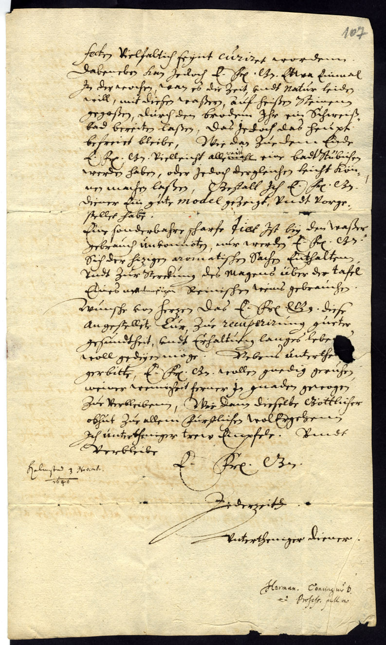Conring was a lawyer, historian and medical doctor, one of the most outstanding scientists of his day, Professor and Rector of Helmstedt University. At the behest of the duchess, Conring provided mineral water for curing gout and stomach-ache, promising to send it to Courland in oak barrels. He recommends that this water be used internally and externally, also in the bath-house. If the duchess had no bath, the doctor was ready to explain how to build one. For strengthening the stomach, he suggested Rhenish wine with meals.