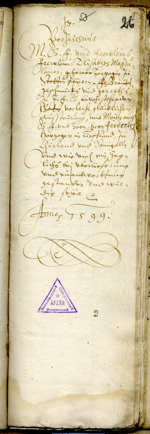 In the letter the duchess tells of the construction of a new church at Grenzhof/Mežmuiža, indicating her wish that the tower should be painted “after the model of the Catholic church in Mitau”, namely red-brown. She also asks the duke to send a non-German (Latvian) apprentice working for the court painter to paint the tower.