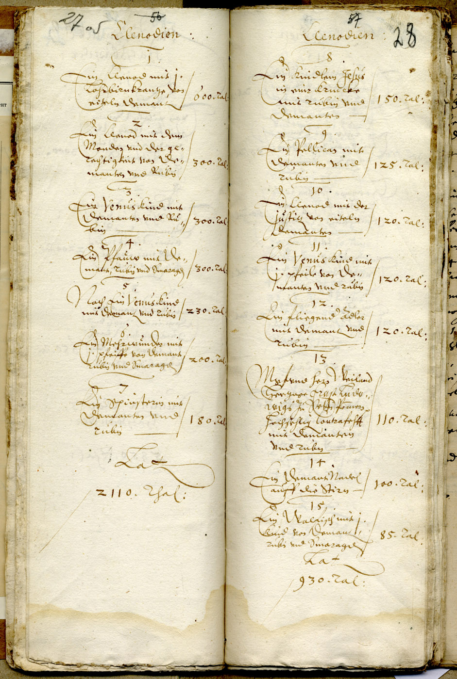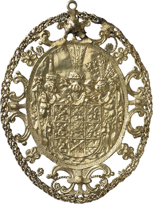 The list takes up 77 pages. It mentions jewellery, fine dress, bed-linen etc., and even two gilded coaches. The total value of the dowry exceeded 50 000 thalers. Listed separately are gifts given to Elisabeth Magdalena by her relatives and the towns of Pomerania. For example, her mother gave her a necklace with diamonds, pearls and a griffin figure, her guardian gave her an ornament “with a cockatoo” and her brother Duke Philip Julius gave her a necklace with the arms of Pomerania and Braunschweig.