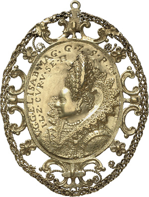 1. Gold medallion with a portrait of the duchess on the obverse. The reverse shows the arms of Pomerania. Original in the Bode Museum, Berlin. Photo: D. Bruģis.