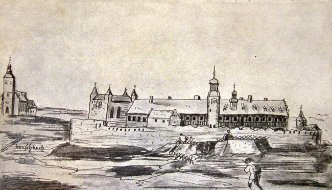 The new Doblen/Dobele Castle was built in the time of Duke Gotthard. Duke Frederick presented the castle and manor to his wife as a gift, also bequeathing it as her dower. The castle complex along with the church was altered in the 1640s on the instructions of Elisabeth Magdalena. Seen at left is the church in the town of Doblen/Dobele.