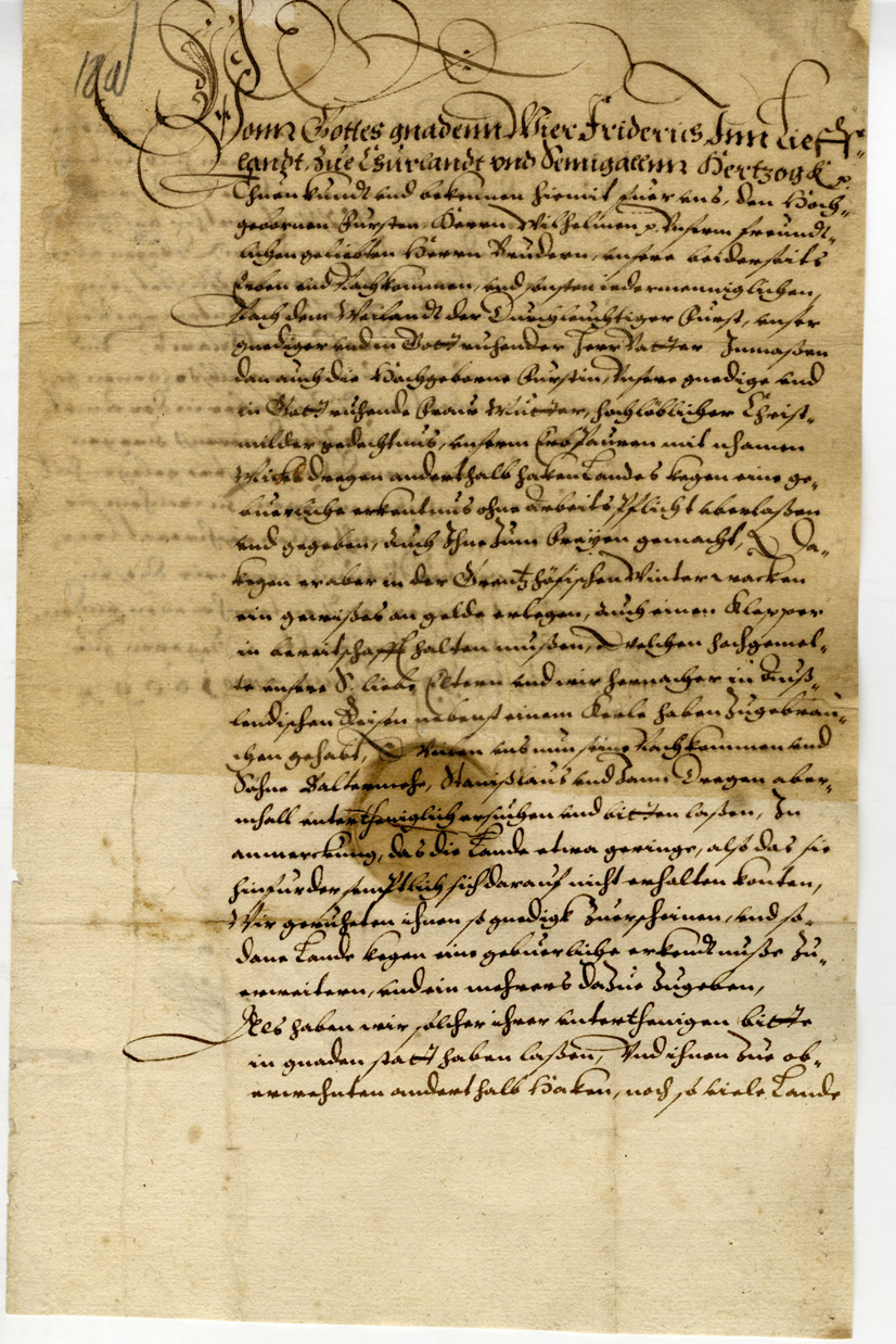 Duke Gotthard and Anna had already granted Michel Dragen, peasant of Grünhof/Zaļenieki, the status of a free peasant, for which he was to pay a certain sum of money every year and provide the dukes with a rider to accompany him on journeys abroad. Now, at the request of Michel's three sons, Duke Frederick was granting them more land, for which they were to pay 200 marks in money every year and must place two manservants with good horses at the disposal of the duke whenever required.