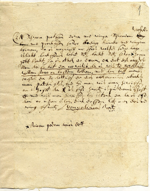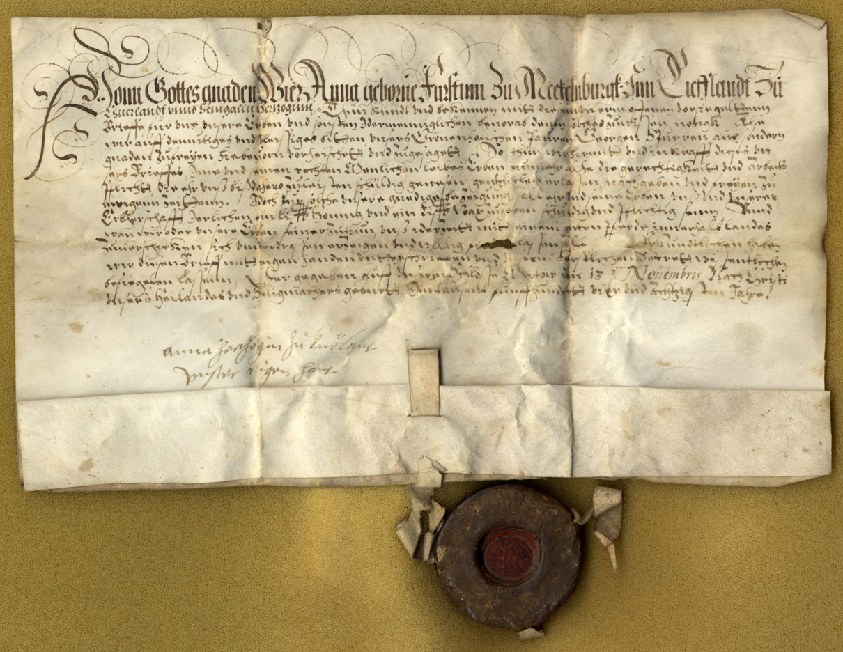 1. Document on the freeing of a peasant, issued by Duchess Anna. Mitau/Jelgava, 13 November 1584. Parchment. LVVA, Collection 5561, Inventory 4, File 680.