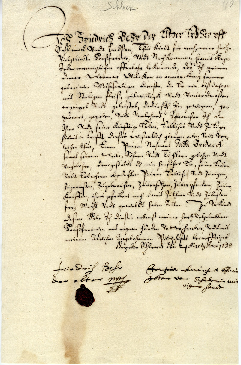 5. Gift document by Friedrich Behr, owner of Schleck/Zlēkas and Laidsen/Laidze Manors. Schleck/Zlēkas, 24 March 1638. LVVA, Collection 1100, Inventory 1, File 42.